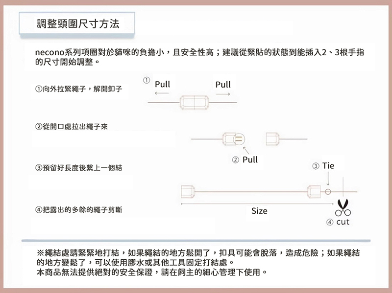 | 注意事項 | -本商品並未提供絕對的安全保證,故請飼主悉心使用 -請勿連接牽引繩使用 -請勿使用於非產品設計之用途 -沒有配戴時,請放置於孩童及寵物無法觸及的地方,避免發生危險 -請存放於乾燥陰涼處,並遠離火源,避免潮濕高溫陽光直射 -避免長時間放置於潮濕環境,避免褪色情形產生 -鈴鐺為手工製作,因此外觀、大小、音色可能會有些許個體差異,屬正常現象非產品瑕疵 -尺寸皆為人工水平測量,會因測量起點等因素,可能存在0.5-1cm的誤差 -基於衛生安全考量,除瑕疵品情形外,退貨必須保持商品為全新未拆封,若已拆封使用恕無法退貨 -每台螢幕因設定及廠牌不同,皆會影響顏色呈現,出貨以實際商品顏色為主 |