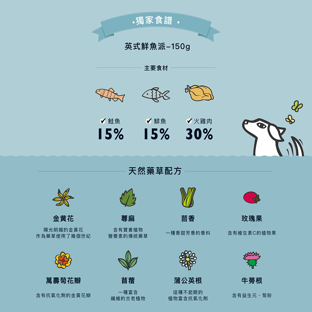 | 藥草&植物 | 金黃花、蕁麻、茴香、芹菜籽、玫瑰果、萬壽菊花瓣、原拉拉藤草、海藻、苜蓿、牛奶薊、蒲公英根、牛蒡根 |