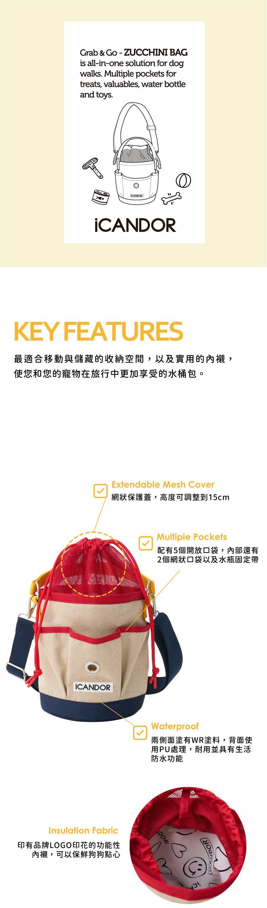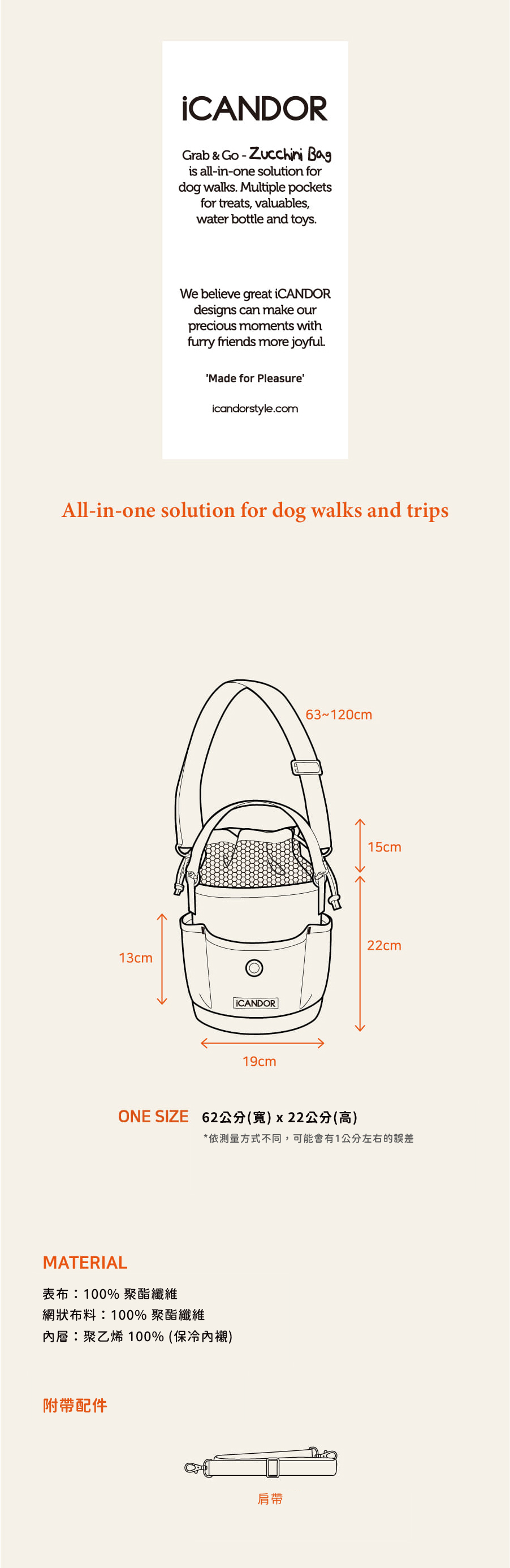 | 材質 | 表布:100% 聚酯纖維 網狀布料:100% 聚酯纖維 內層:聚乙烯 100% (保冷內襯) |