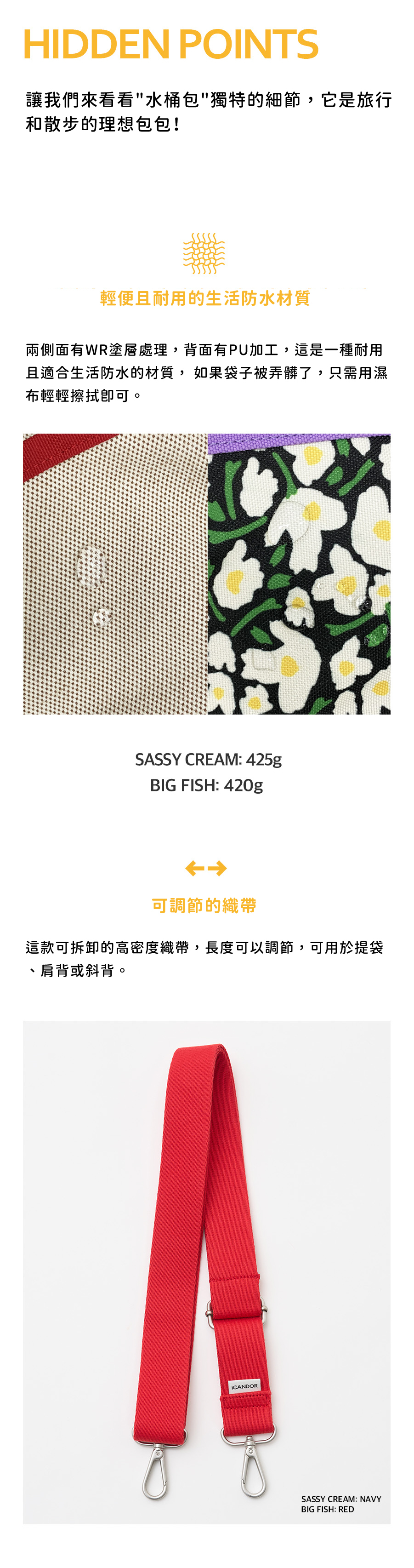 | 洗滌說明 | -若有髒汙可用濕布搭配中性洗劑局部清潔 -整體清潔請用低於30度的溫、冷水,並使用中性洗劑單獨手洗洗滌 -清洗後請放置通風陰涼處風乾即可,避免陽光曝曬 -盡量降低全清洗次數,以保持面料和維持袋體形狀 -請勿漂白 -請勿熨燙 -請勿烘乾 |