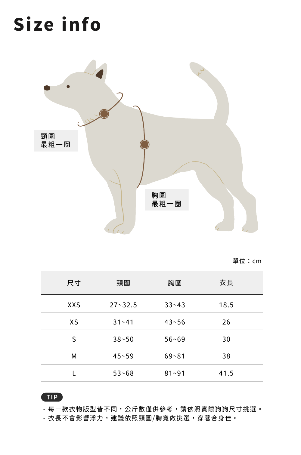 | 注意事項 | -使用時請務必時刻在旁陪伴,隨時注意協助 -下水前務必將浮力衣調成整適合狗狗身形的尺寸 -由於手工車縫及測量方式略有不同,尺寸皆為人工水平測量,會因布料彈性、測量起點等因素,可能存在0.5-1cm的誤差 -基於衛生安全考量,除瑕疵品情形外,退貨需保持全新未使用 |