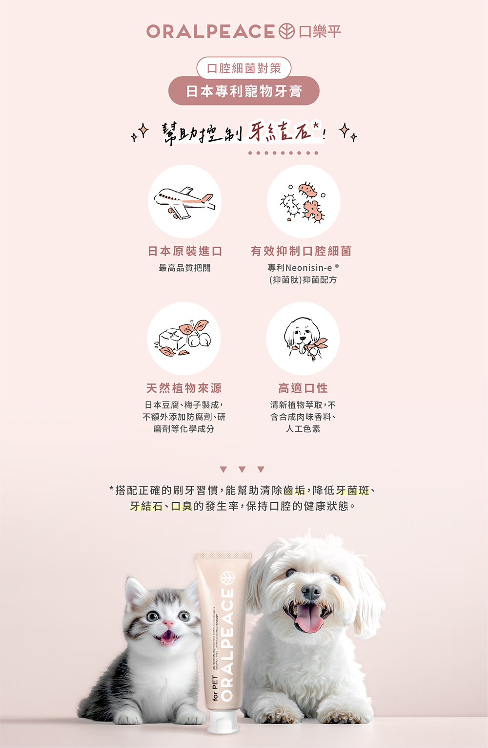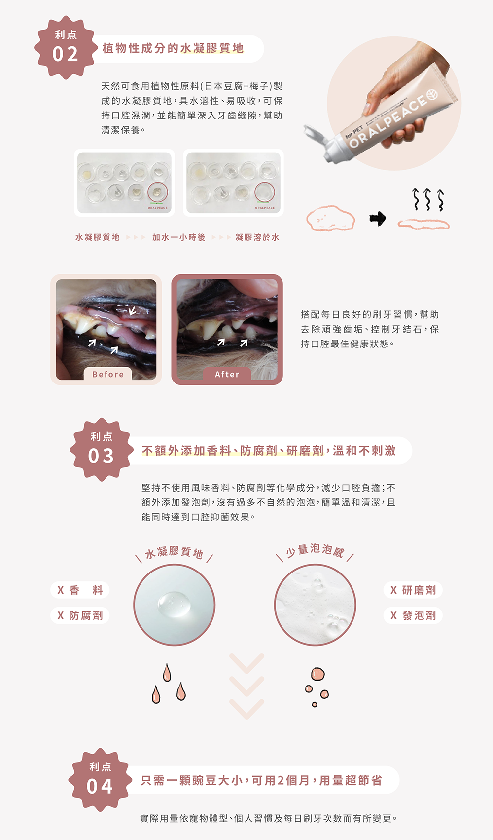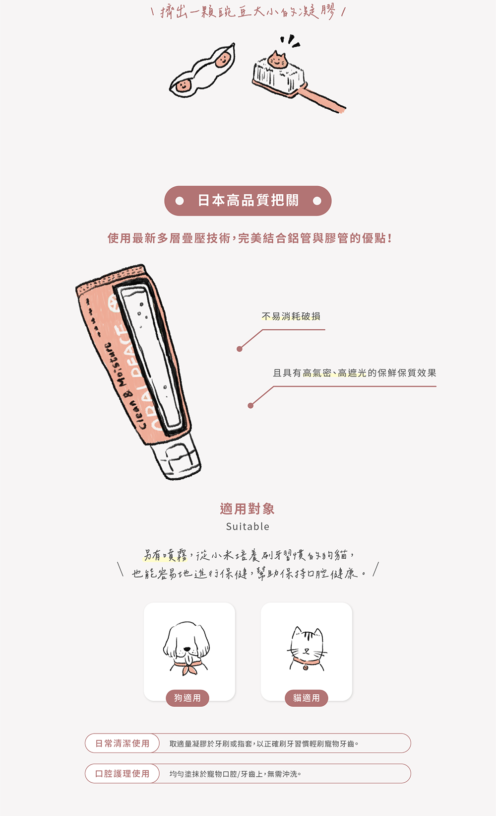 | 使用方式 | 取適量凝膠於牙刷或指套,均勻塗抹於寵物口腔/牙齒上,無需沖洗 |