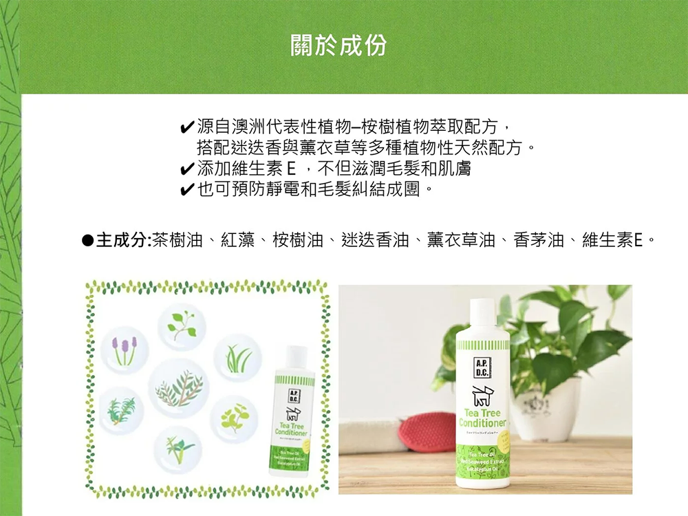 | 成分 | 茶樹油、紅藻、桉樹油、迷迭香油、薰衣草油、香茅油、維生素E |
