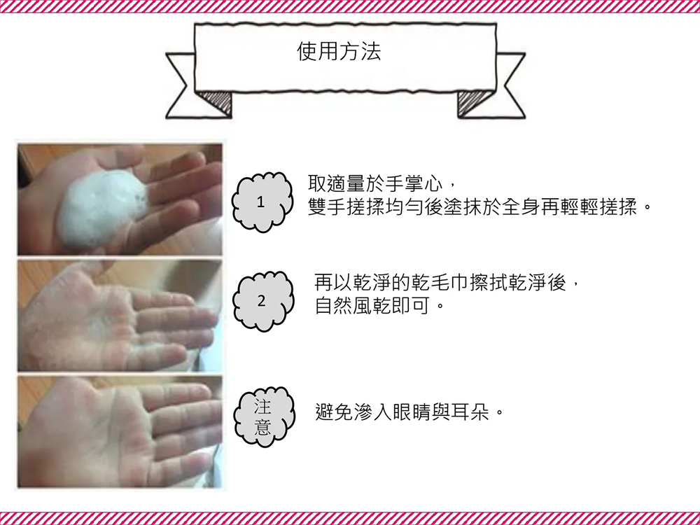 | 使用說明 | 使用前請搖一搖,取適量於手掌心,均勻塗抹於全身或髒污處(避免滲入眼睛與耳朵),再以衛生紙或毛巾擦拭乾淨後,使用梳子梳開即可(不需再使用吹風機吹乾)。 |