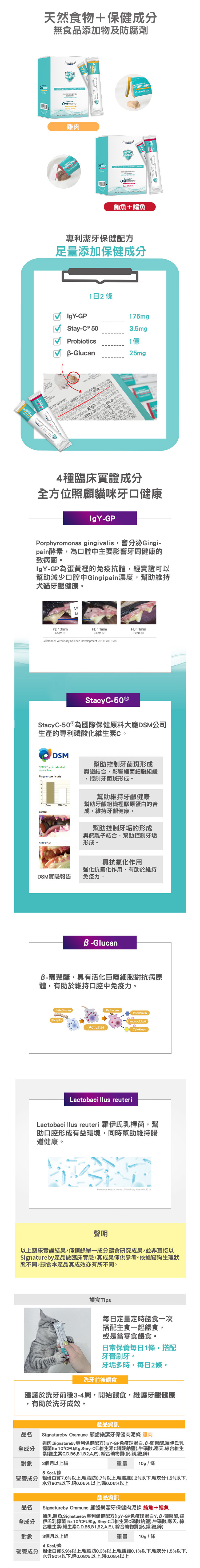 | 鮪魚+鱈魚口味/成分 | 鮪魚、鱈魚、Signatureby專利保健配方(IgY-GP 免疫球蛋白、β-葡聚醣、羅伊氏乳桿菌 5×10⁹CFU/Kg、Stay-C® 維生素C磷酸鈉鹽)、牛磺酸、寒天、綜合維生素(維生素C、D、B6、B1、B2、A、E)、綜合礦物質(鈣、鎂、鐵、鋅) |