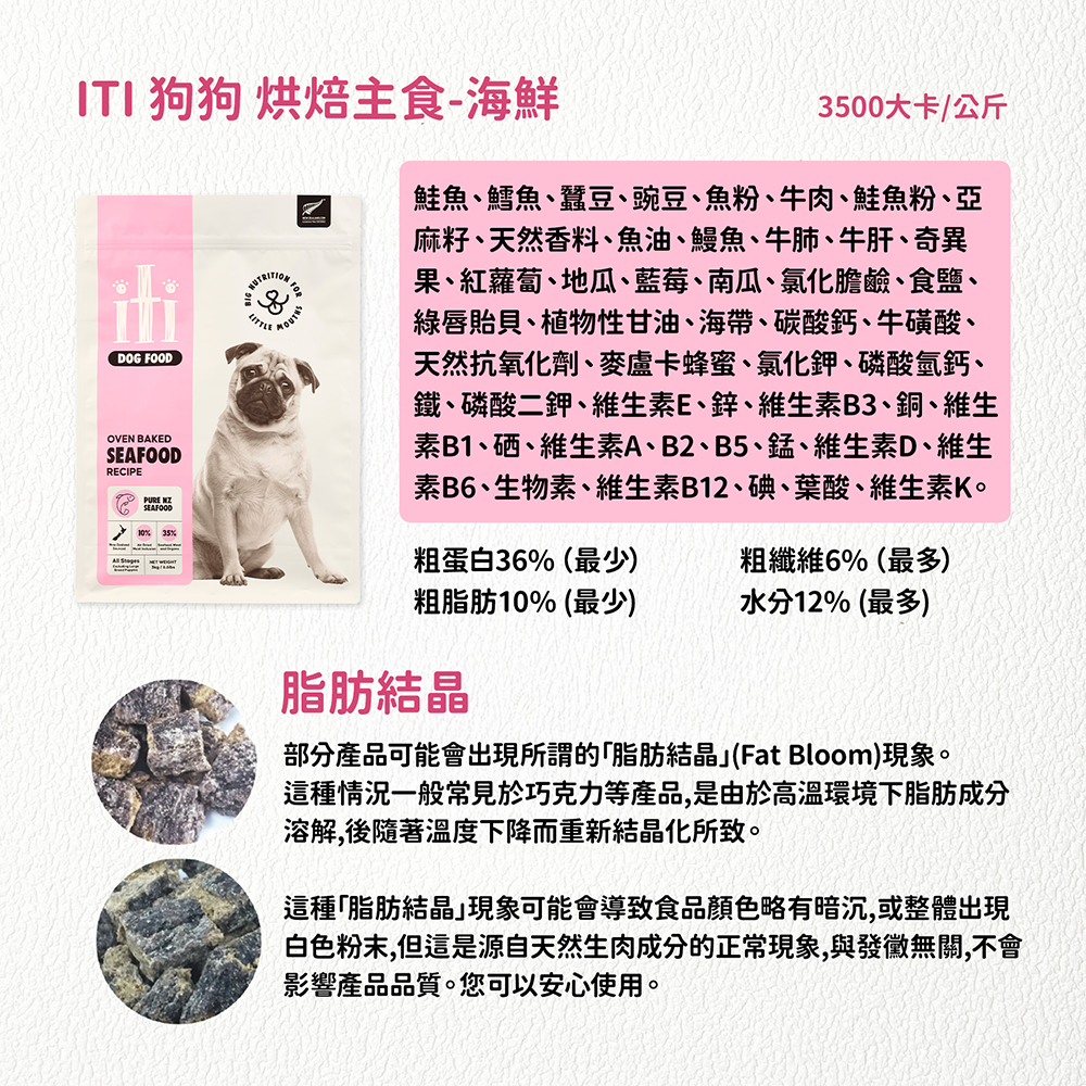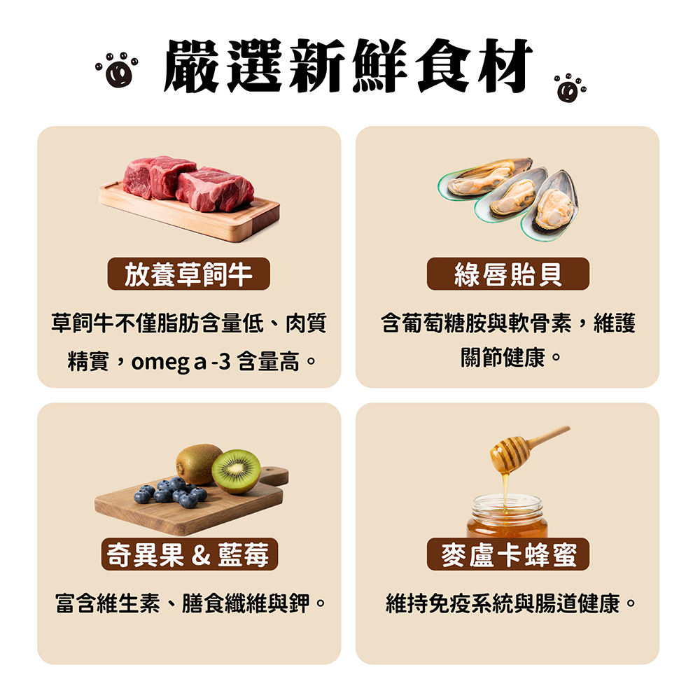 | 成分 | 鮭魚、鱈魚、蠶豆、豌豆、魚粉、牛肉、鮭魚粉、亞麻籽、天然香料、魚油、鰻魚、牛肺、牛肝、奇異果、紅蘿蔔、地瓜、藍莓、南瓜、氯化膽顧、食鹽、綠唇貽貝、植物性甘油、海帶、碳酸鈣、牛磺酸、天然抗氧化劑、麥盧卡蜂蜜、氯化鉀、磷酸氫鈣、鐵、磷酸二鉀、維生素E、鋅、維生素B3、銅、維生素B1、硒、維生素A、B2、B5、錳、維生素D、維生素B6、生物素、維生素B12、碘、葉酸、維生素K |