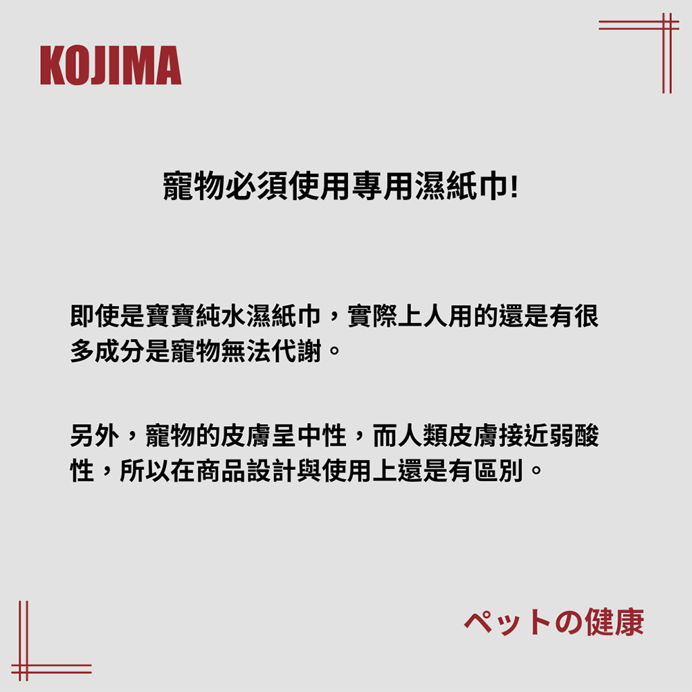 | 注意事項 | -本產品為寵物專用,請勿使用於設計以外之用途 -本產品僅供外用不得食用,若有誤食情形請立刻就醫 -本產品不溶於水,請勿直接丟入馬桶,避免造成堵塞 -使用後,需將開口處密封貼紙重新密封好,防止濕巾水分蒸發 -使用後如有不適情況,請立即停用,並諮詢獸醫師 -請勿使用於皮膚患處,避免對傷口造成刺激 -沒有使用時,請存放於孩童、寵物無法觸及的地方,避免發生危險 -請存放於乾燥陰涼處,避免潮濕、高溫、陽光直射處 |