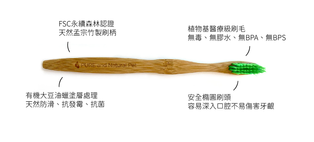 | 保存方法 | 每次使用完後請將竹製無毒牙刷用清水清洗乾淨後放置於通風乾燥處風乾,為維持毛孩口腔衛生建議至少每三個月更換新的牙刷。 |