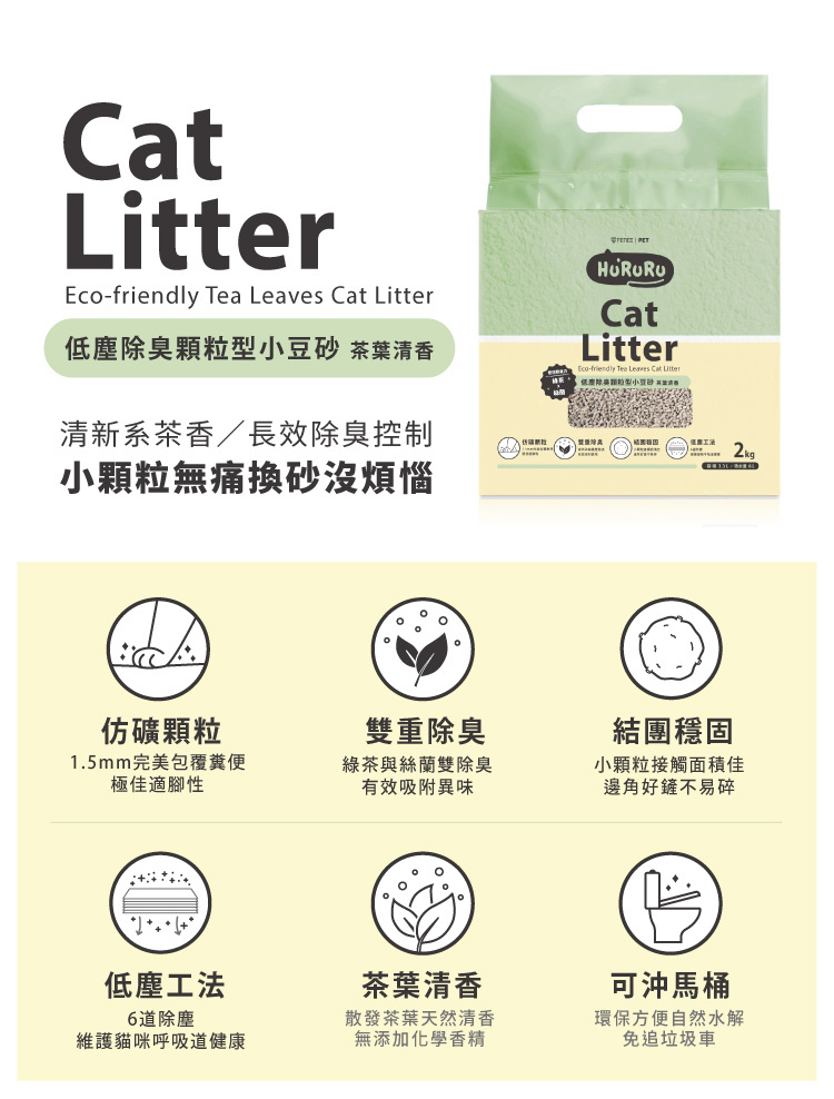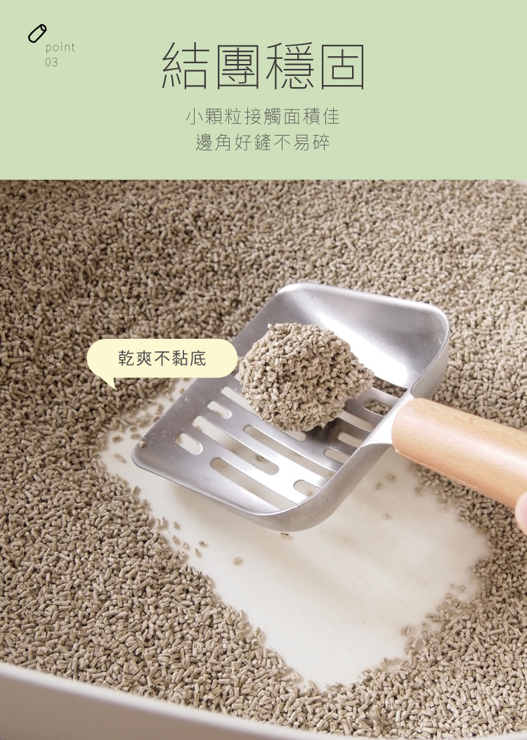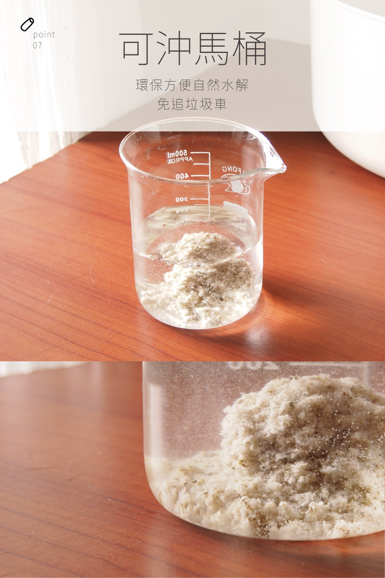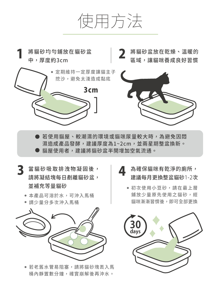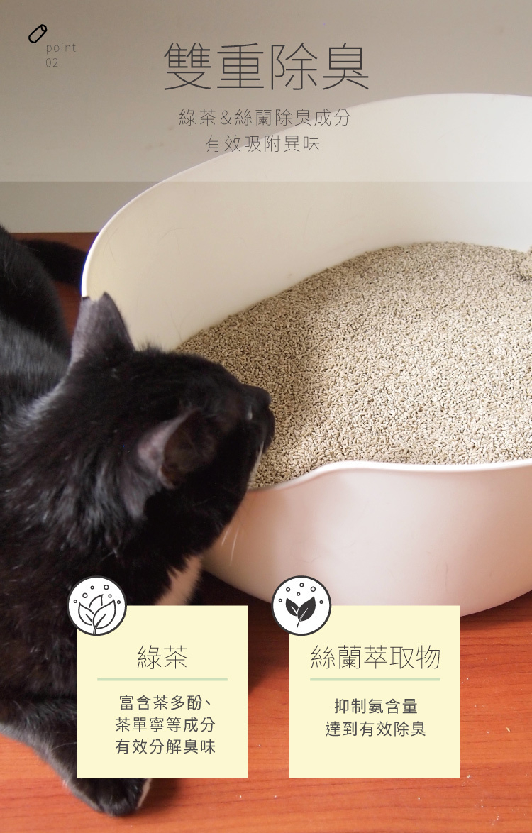 | 注意事項 | -本產品少量誤食無礙,若不慎大量誤食請洽詢醫師或獸醫協助 -請勿直接放置於潮濕處,並應收妥於兒童無法取得處 -產品生產、運送過程會產生粉末碎屑,但不影響產品使用 -請勿使用於非產品設計之用途 -本產品需搭配單層貓砂盆使用 -真空包裝是為了方便裝箱運送,運送中可能導致真空漏氣,為正常現象不影響品質,請放心使用 |
