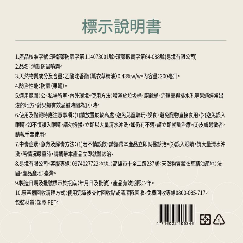 核准字號:環衛藥防蟲字第114073101號