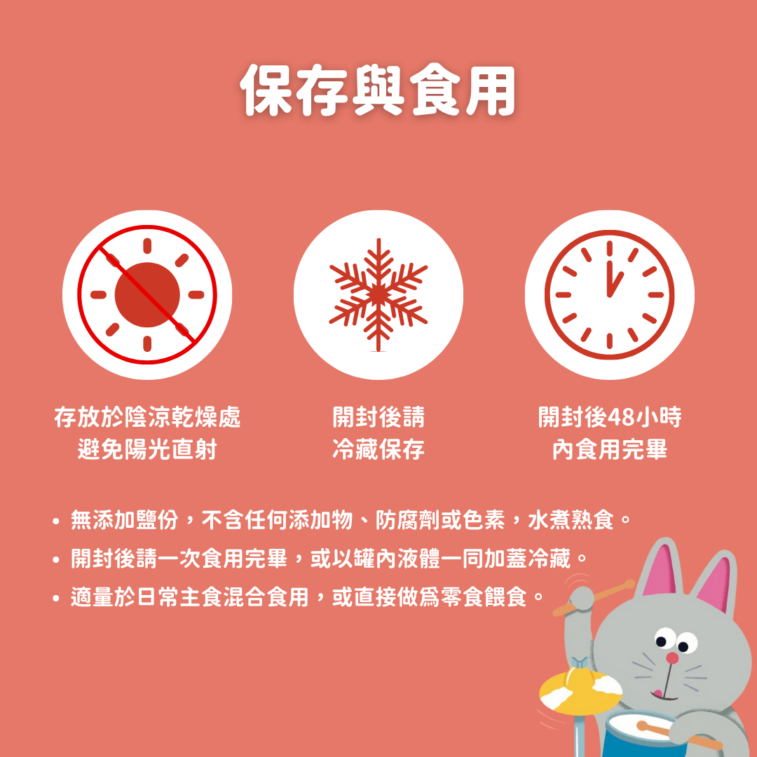 | 保存方式 | 請存放於陰涼乾燥處。 建議於室溫下餵食。 開封後請一次食用完畢,或密封冷藏保存,並於 48 小時內食用完畢。 |