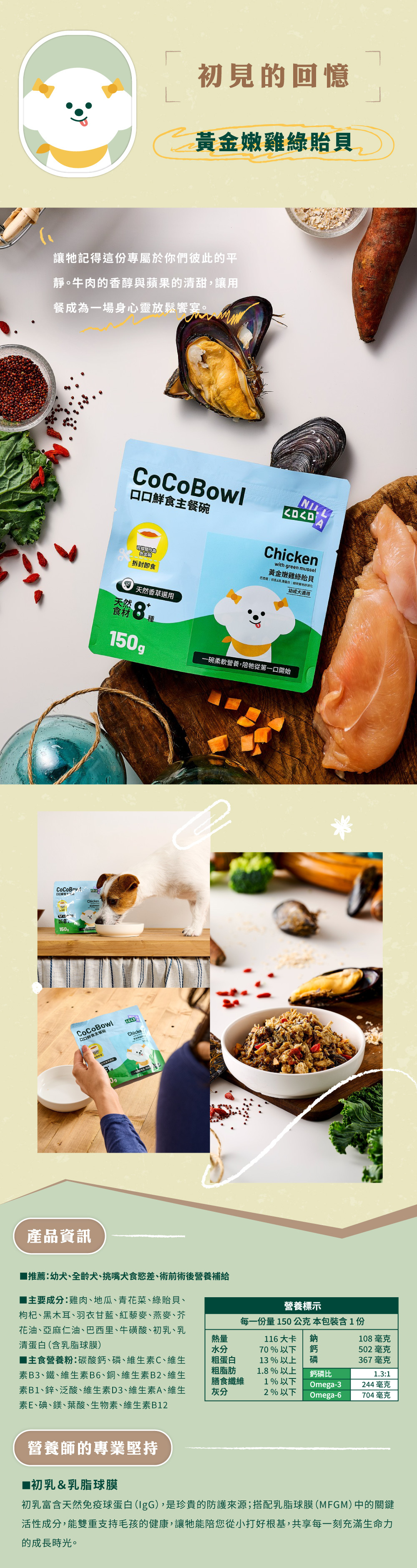 | 成分 | 雞肉、地瓜、青花菜、綠貽貝、枸杞、黑木耳、羽衣甘藍、紅藜麥、燕麥、芥花油、亞麻仁油、巴西里、牛磺酸、初乳、乳清蛋白(含乳脂球膜) 主要營養粉:碳酸鈣、磷、維生素C、維生素B3、鐵、維生素B6、銅、維生素B2、維生素B1、鋅、泛酸、維生素D3、維生素A、維生素E、碘、鎂、葉酸、生物素、維生素B12 |