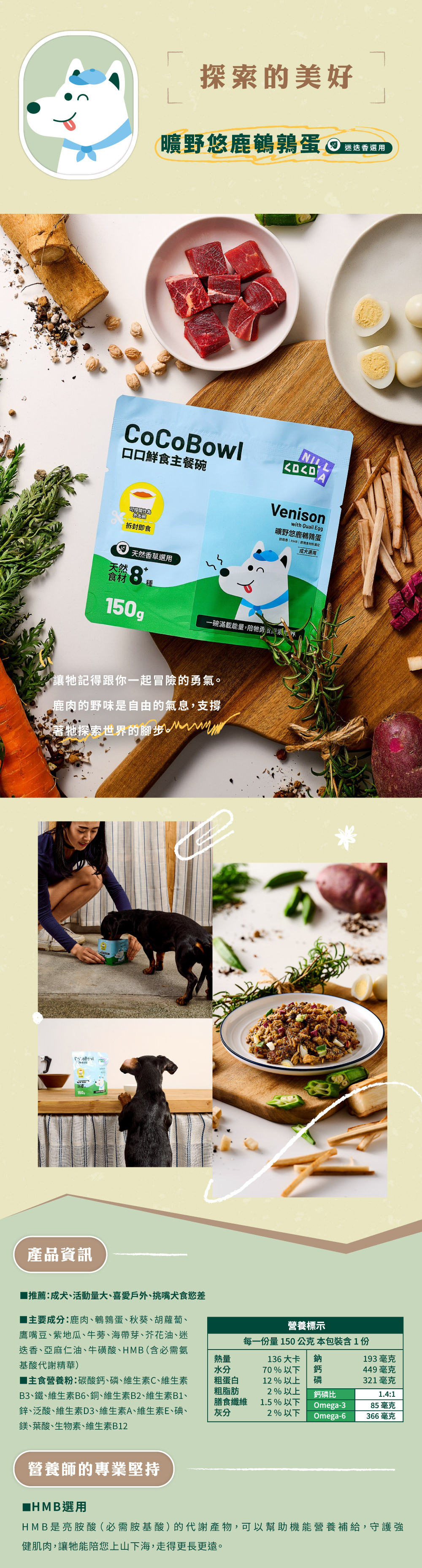 | 成分 | 鹿肉、鵪鶉蛋、秋葵、胡蘿蔔、鷹嘴豆、紫地瓜、牛蒡、海帶芽、芥花油、迷迭香、亞麻仁油、牛磺酸、HMB(含必須氨基酸代謝精華) 主要營養粉:碳酸鈣、磷、維生素C、維生素B3、鐵、維生素B6、銅、維生素B2、維生素B1、鋅、泛酸、維生素D3、維生素A、維生素E、碘、鎂、葉酸、生物素、維生素B12 |