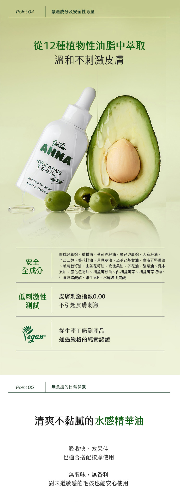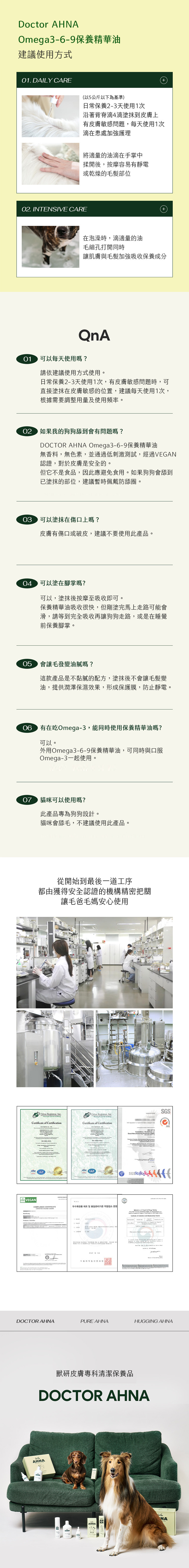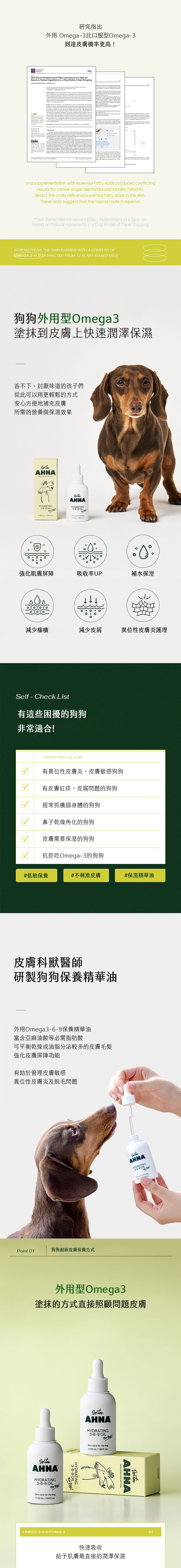 | 使用方式 | -本產品為狗狗外用皮膚保養護理油,也可當作狗狗按摩油使用 -日常保養可以每週使用1-2次,皮膚狀況不佳時,可以增加每週使用頻率 |