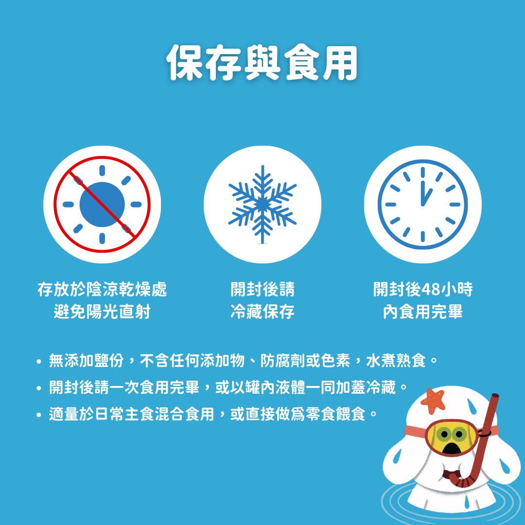 | 保存方式 | 請存放於陰涼乾燥處。 建議於室溫下餵食。 開封後請一次食用完畢,若未能食畢,請保留原有的液體湯汁密封好,並於 48 小時內食用完畢。 |