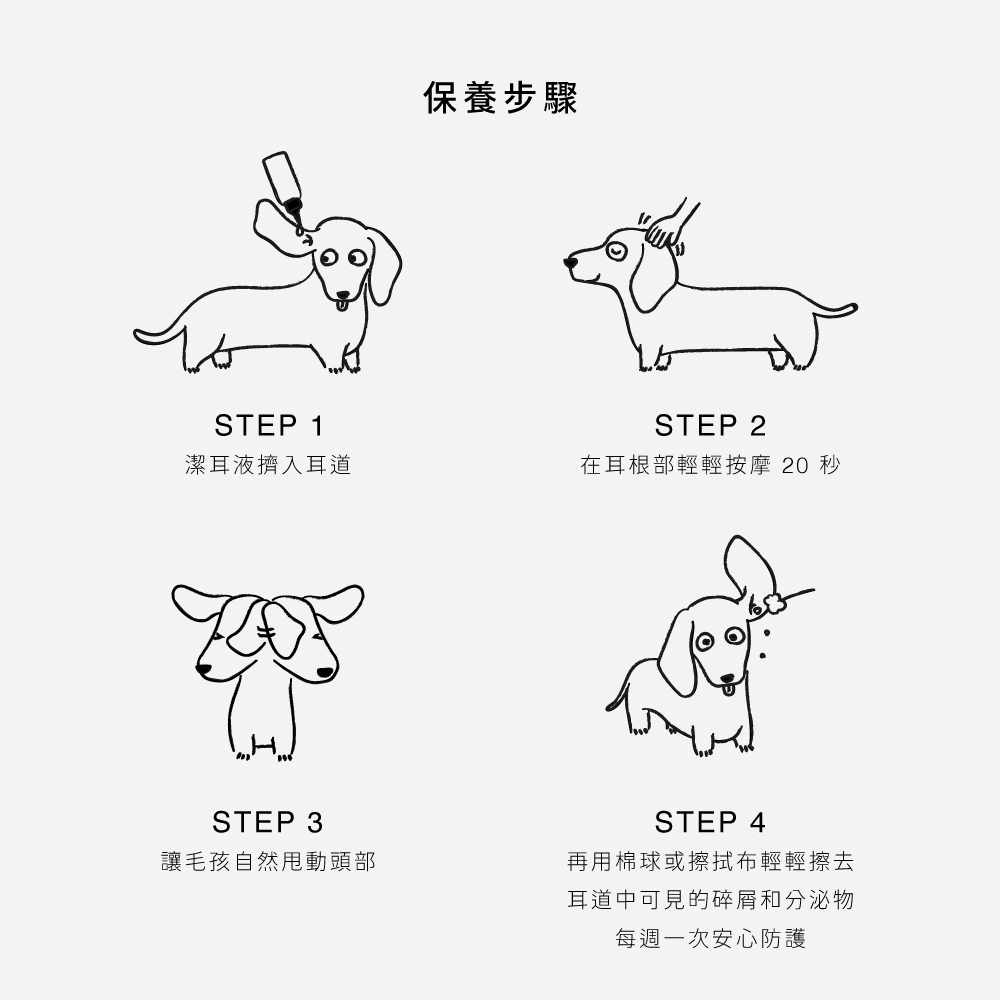 潔耳液擠入耳道,在耳根部輕輕按摩20秒。讓寵物甩動頭部,再用棉球或擦拭布輕輕擦去耳道中可見的碎屑和分泌物。 建議每週使用一次。 |