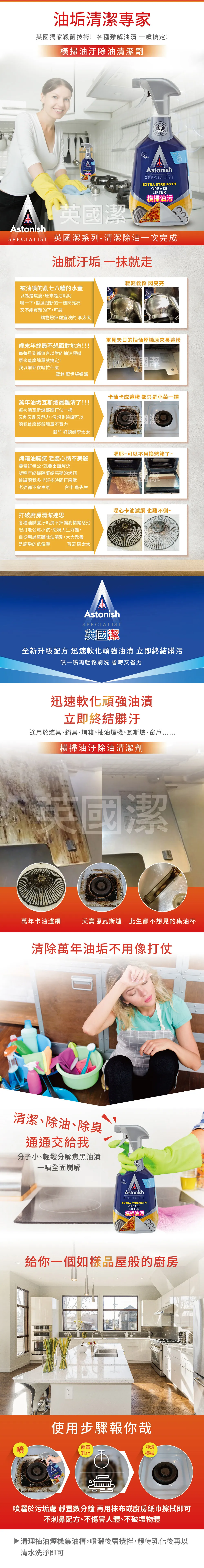 | 使用說明 | 1. 直接噴灑於汙垢處,靜置1-2分鐘。 2. 再用乾淨的濕布擦拭即可。 3. 若清理重度油汙,重複以上清潔步驟,適度刷洗。 |