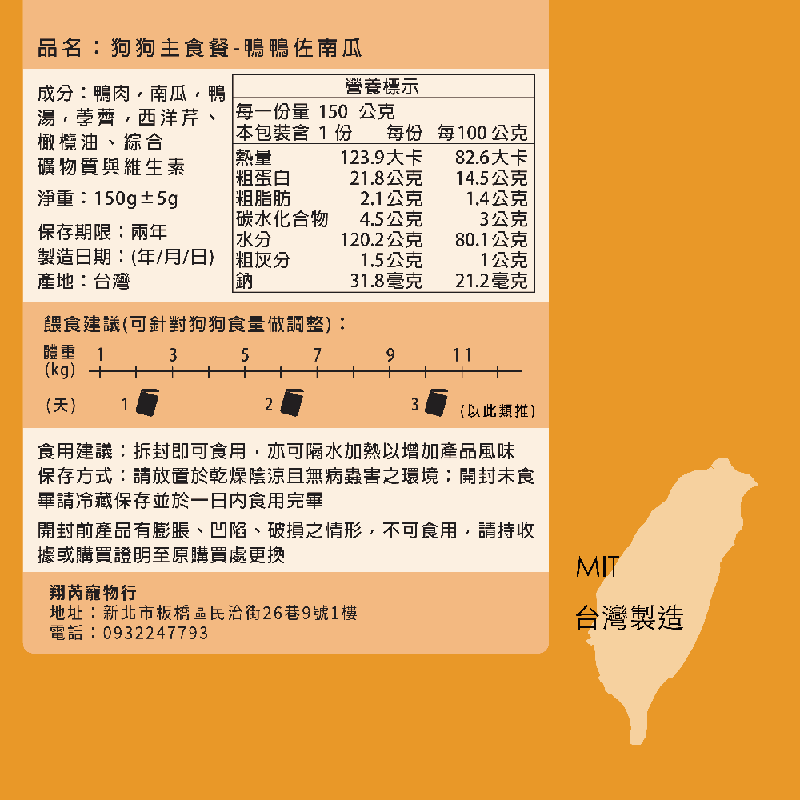 | 成分 | 鴨肉、南瓜、鴨湯、荸薺、西洋芹、橄欖油、綜合礦物質、維生素 |