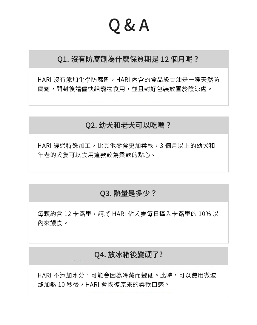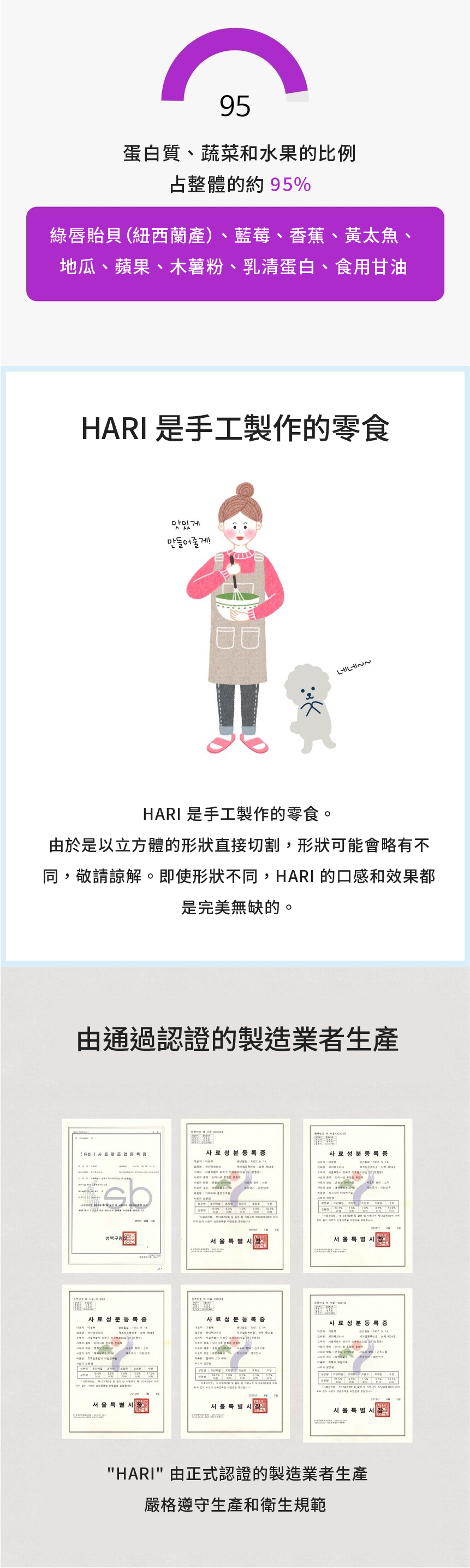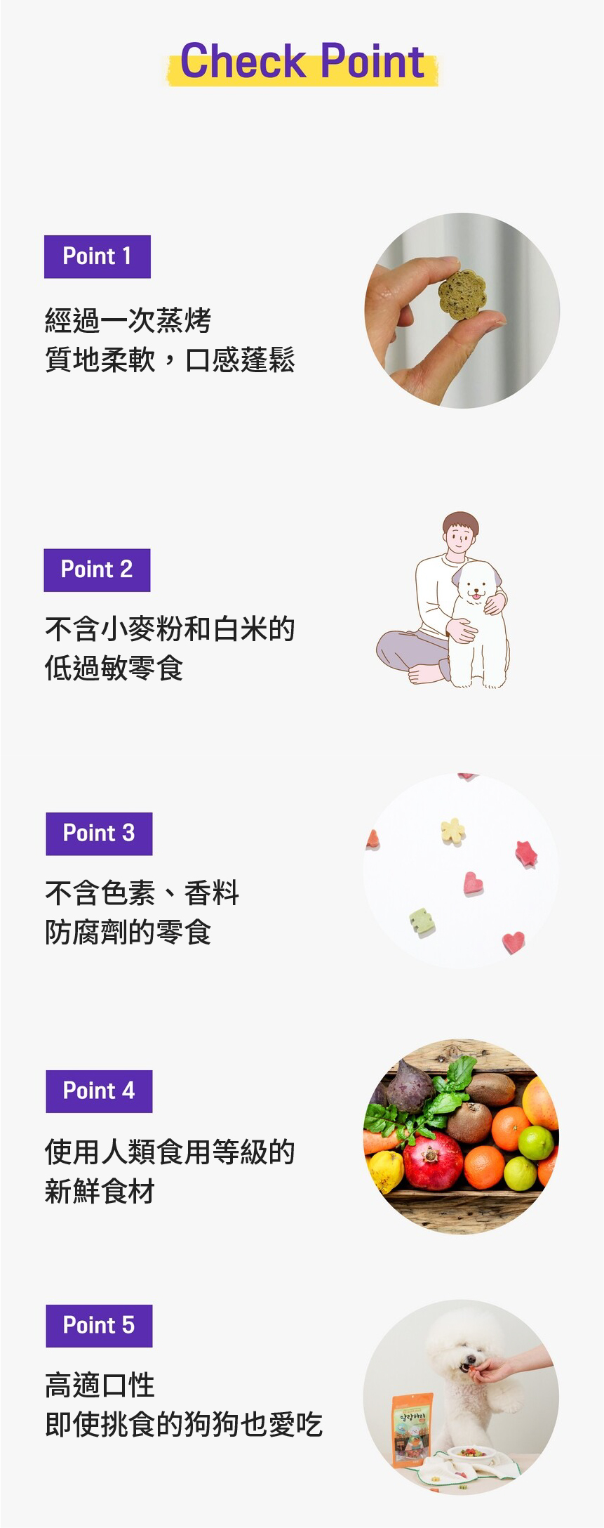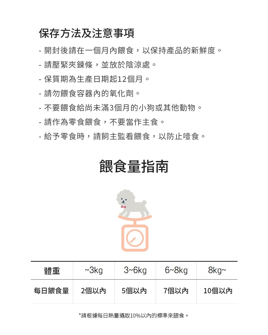 | 注意事項 | - 開封後請在一個月內餵食,以保持產品的新鮮度。 - 請壓緊夾鍊條,並放於陰涼處。 - 保質期為生產日期起12個月。 - 請勿餵食容器內的氧化劑。 - 不要餵食給尚未滿3個月的小狗或其他動物。 - 請作為零食餵食,不要當作主食。 - 給予零食時,請飼主監看餵食,以防止噎食。 |