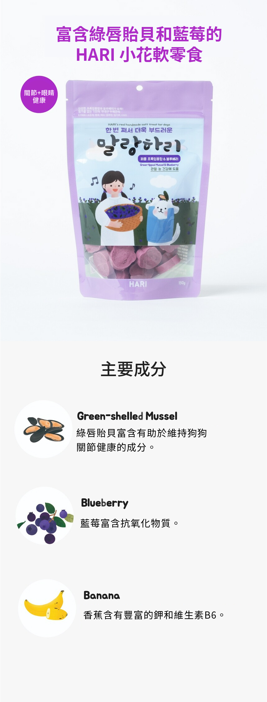 | 成分 | 綠唇貽貝(紐西蘭產)、藍莓、香蕉、黃太魚、地瓜、蘋果、木薯粉、乳清蛋白、食用甘油 |