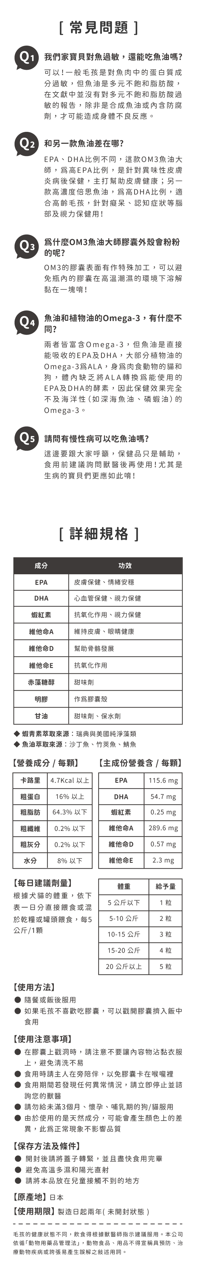 | 注意事項 | -在膠囊上戳洞時,請注意不要讓內容物沾黏衣服上,避免清洗不易 -食用時請主人在旁陪伴,以免膠囊卡在喉嚨裡 -食用期間若發現任何異常情況,請立即停止並詢您的獸醫 -請勿給未滿3個月、懷孕、哺乳期的狗/貓服用 -由於使用的是天然成分,可能會產生顏色上的差異,此為正常現象不影響品質 |