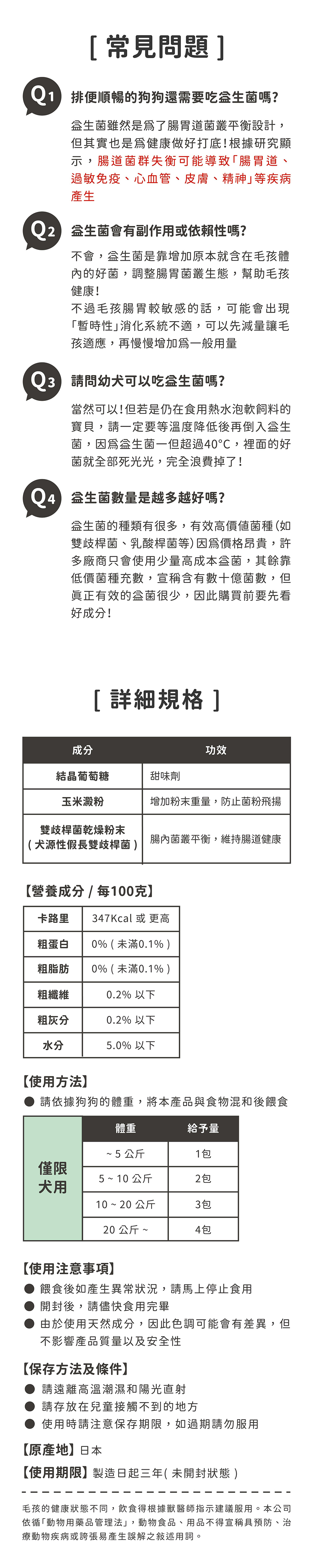 | 成分 | 結晶葡萄糖、玉米澱粉、雙歧桿菌乾燥粉末(犬源性假長雙歧桿菌) |