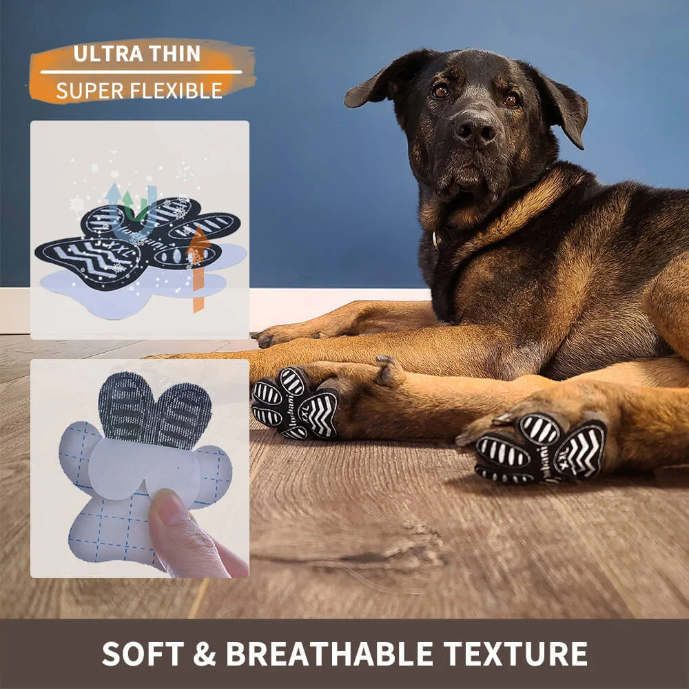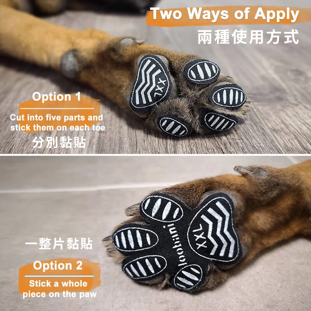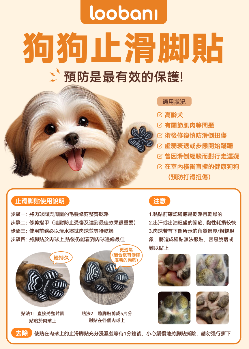 Loobani狗狗止滑貼,像OK繃般容易使用,只需黏貼在於狗狗肉球上,止滑貼上的矽膠止滑點,就能在肉球與地面間提供足夠的阻力,來支撐狗狗的肢體活動,達到防滑止滑的效果。