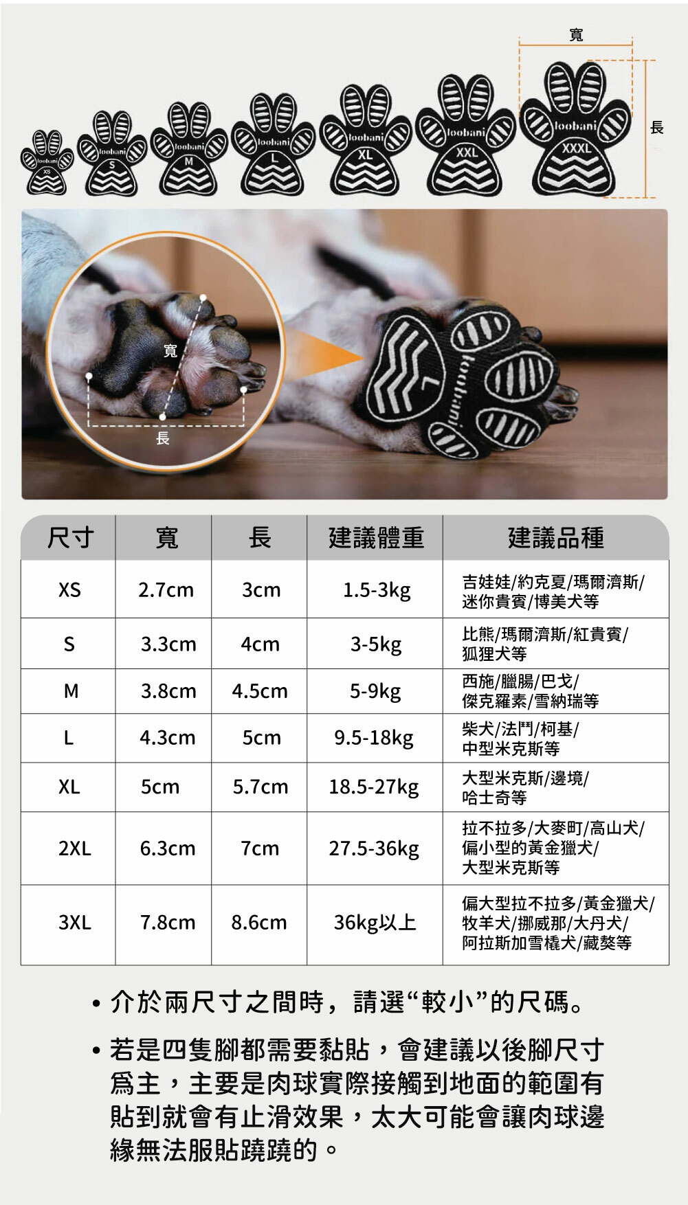 - 大部分中大型~大型犬,尤其是腳底分泌油脂與排汗旺盛的犬種,或是在肢體支撐力不足的狀況下,因腳底會與地面產生較大的摩擦阻力,則有可能發生腳貼一天內就脫落的狀況