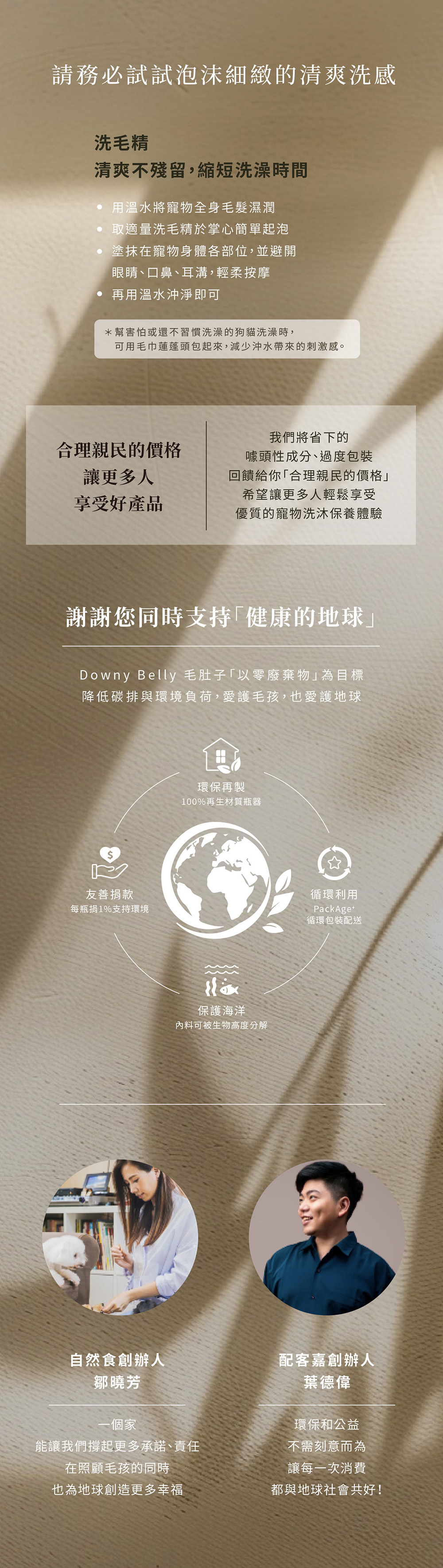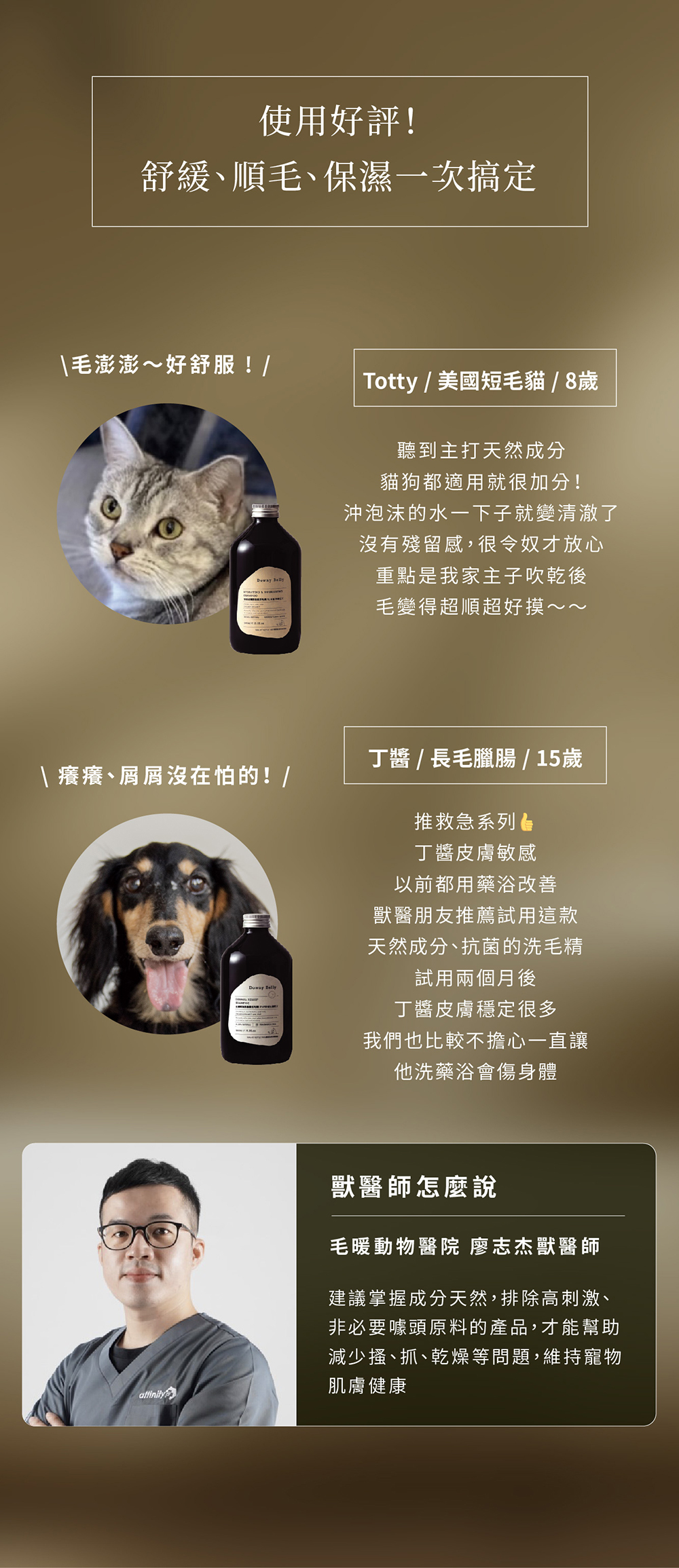 | 使用方式 | 用溫水將寵物全身毛髮濕潤,取適量洗毛精於掌心簡單起泡,塗抹在寵物身體各部位,並避開眼睛、口鼻、耳溝,輕柔按摩,再用溫水沖淨即可 |