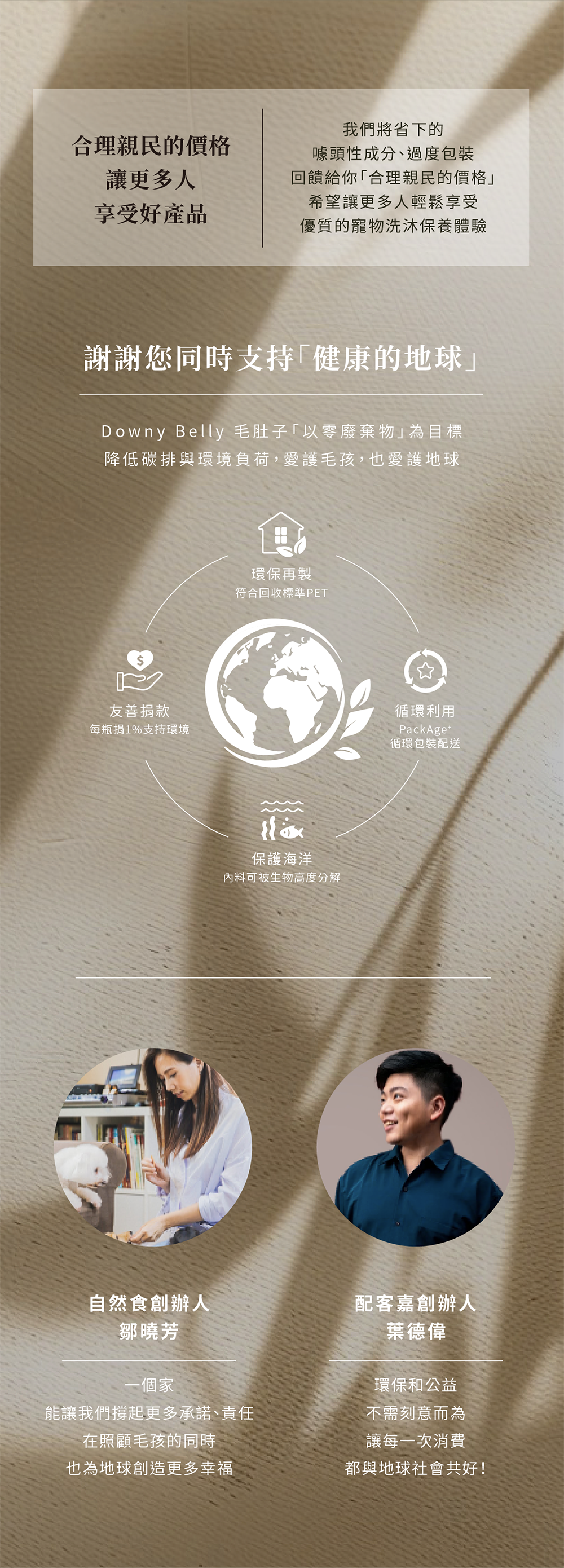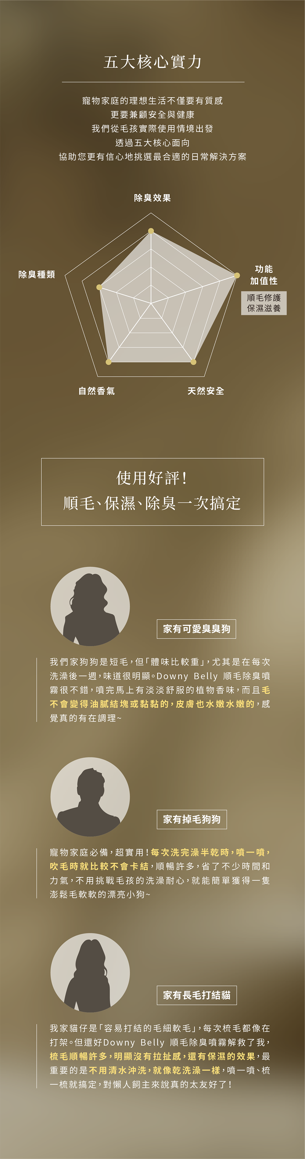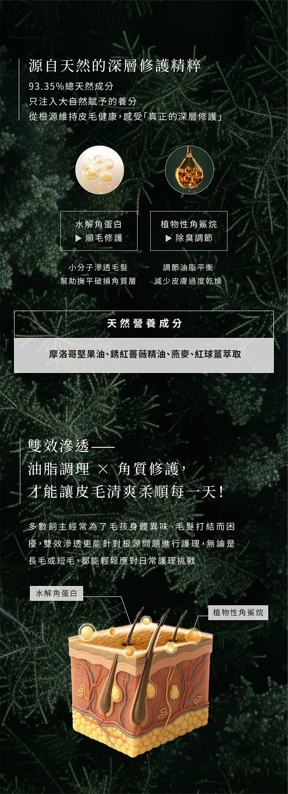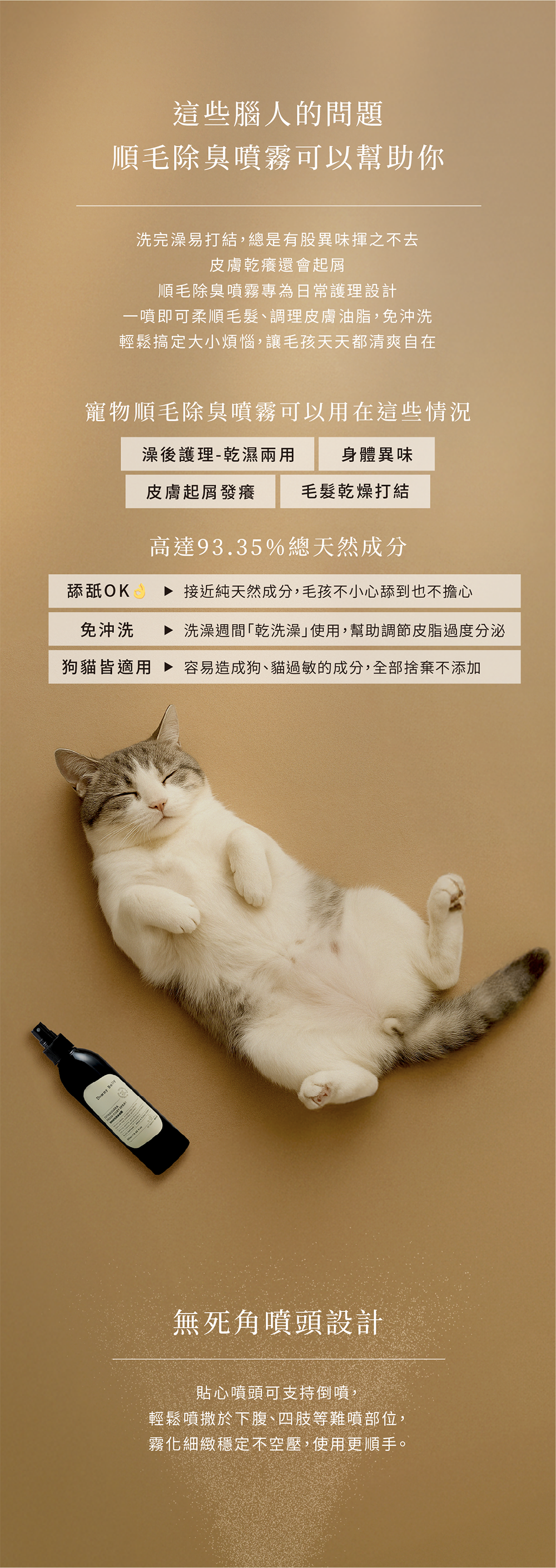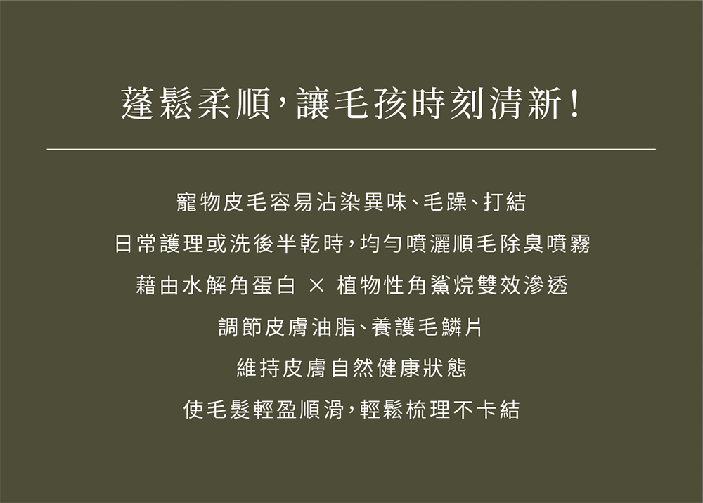 | 使用方式 | 將噴霧均勻噴灑於寵物的毛髮及皮膚上,避免接觸眼部。可隨時使用於日常護理,特別是毛髮打結或皮膚乾燥的時候。使用後不需要沖洗,輕輕梳理毛髮,讓保養成分完全吸收。 |