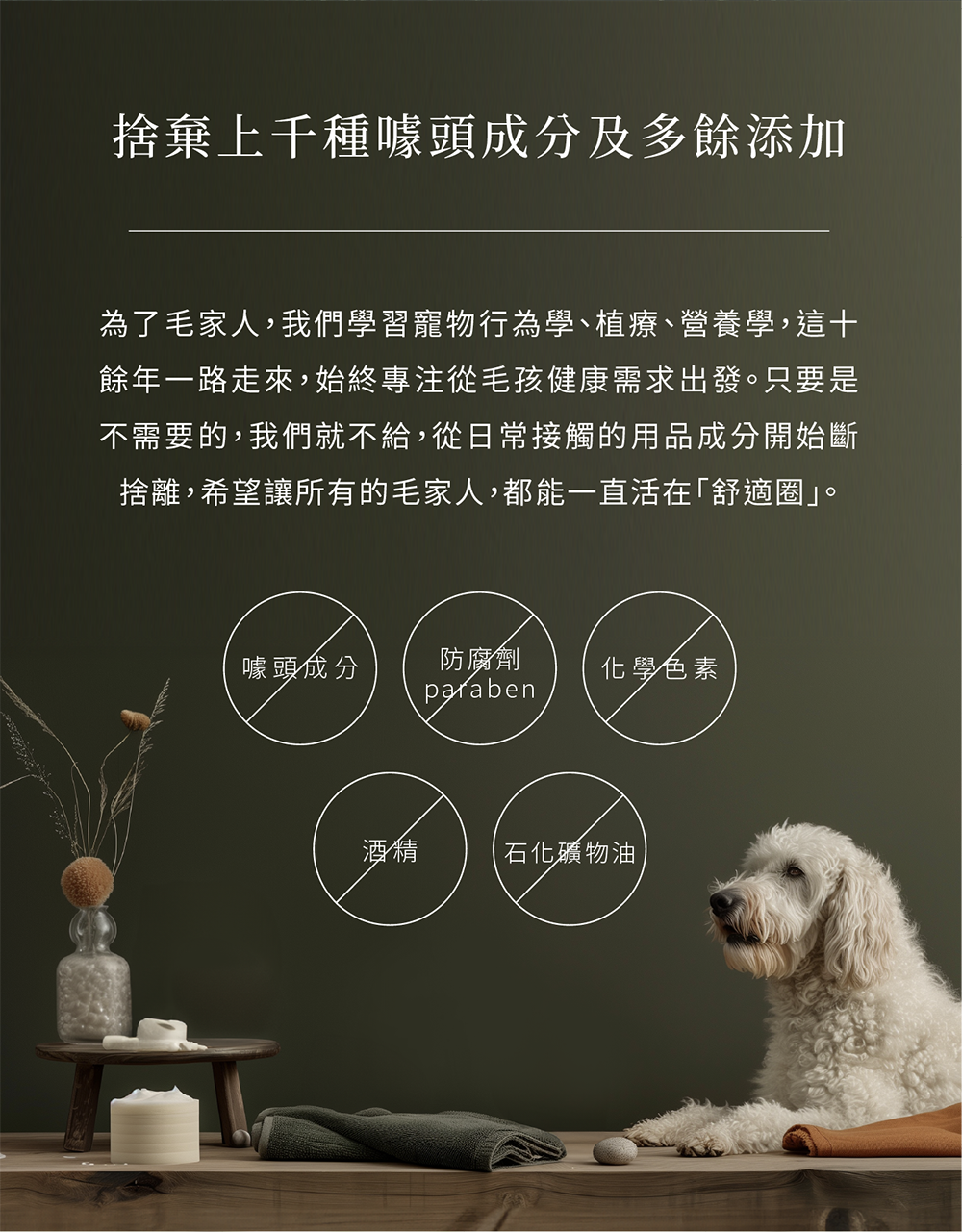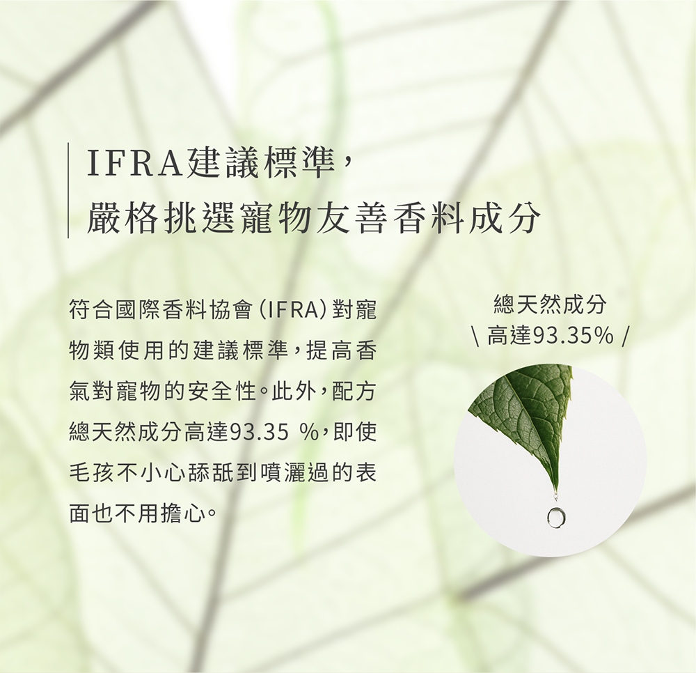 | 注意事項 | -請勿使用於非產品設計之用途 -請勿直接接觸眼口鼻等黏膜部位;使用後如有不適請立即停止使用 ,並諮詢獸醫。 -本產品含植萃精油成分,若變色或沈澱屬正常現象 -請放置於陰涼乾燥處,避免高溫潮濕、陽光直射環境,並遠離火源 -沒有使用時,請存放在孩童及寵物無法觸及的地方,避免發生危險  |
