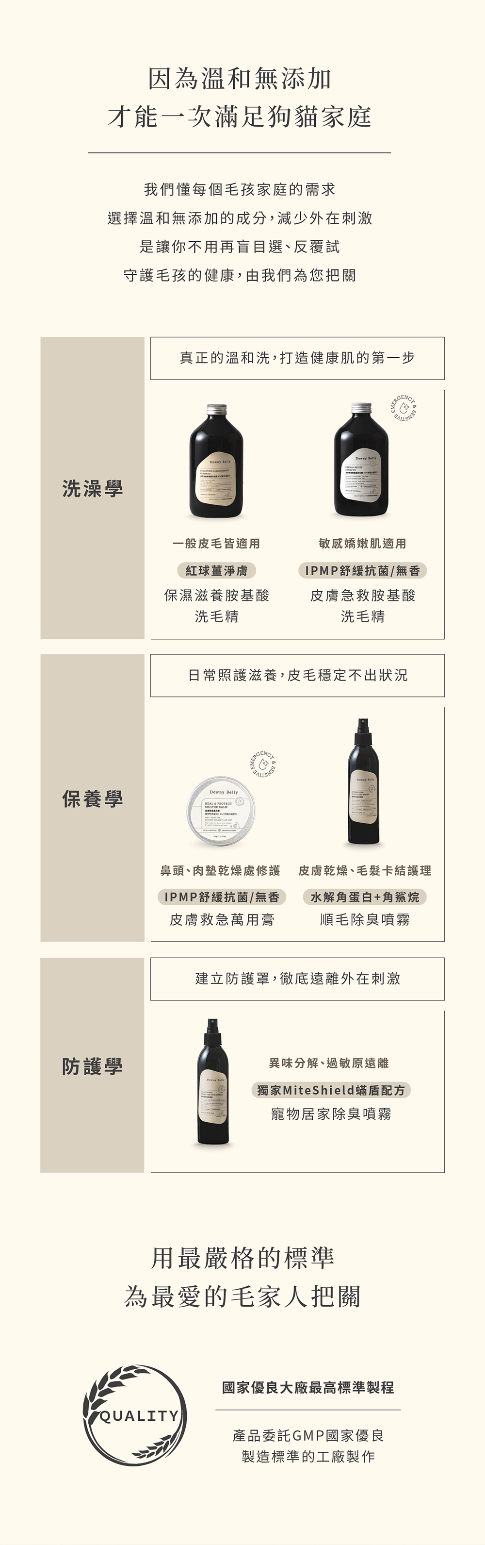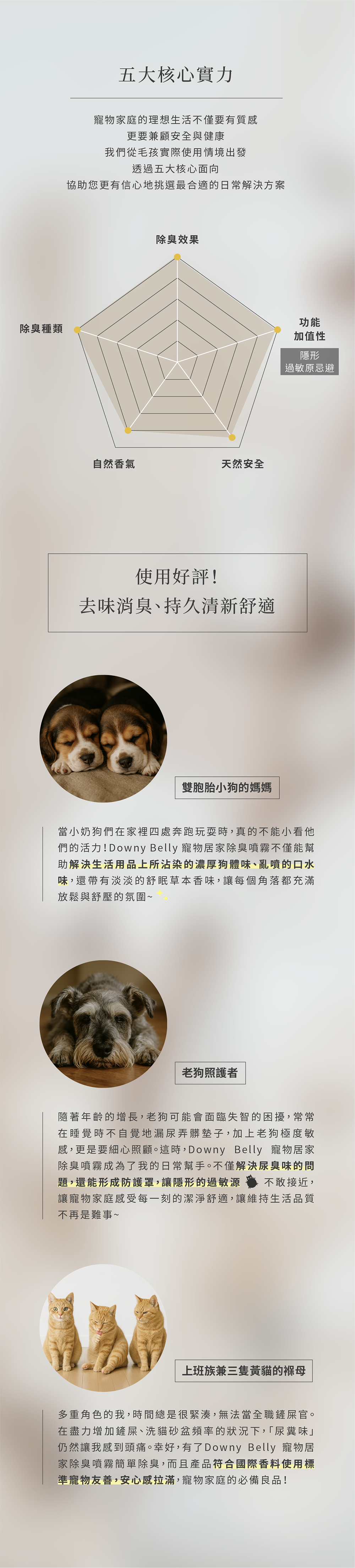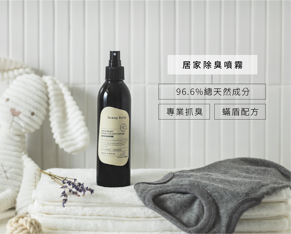 | 使用方式 | 適量噴灑於寵物衣物、外出包、推車內墊,幫助驅趕不請自來的細微存在;亦可用於便盆、居家角落去味消臭,降低便溺異味。噴灑後靜置,自然風乾即可。 |
