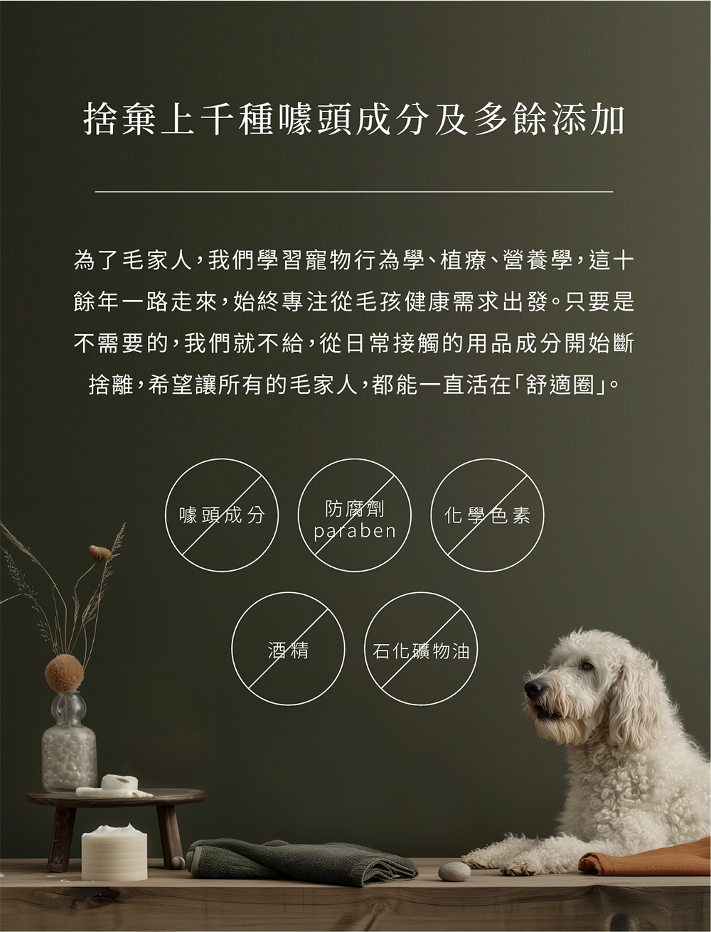 | 注意事項 | -請勿使用於非產品設計之用途 -請勿接觸眼口鼻等內膜部位或直接噴灑在寵物身上,並保持空氣流通;使用後如有不適請立即停止使用 ,並諮詢獸醫師 -本產品含植萃精油成分,若變色或沈澱屬正常現象 -請放置於陰涼乾燥處,避免高溫潮濕、陽光直射環境,並遠離火源 -沒有使用時,請存放在孩童及寵物無法觸及的地方,避免發生危險  |