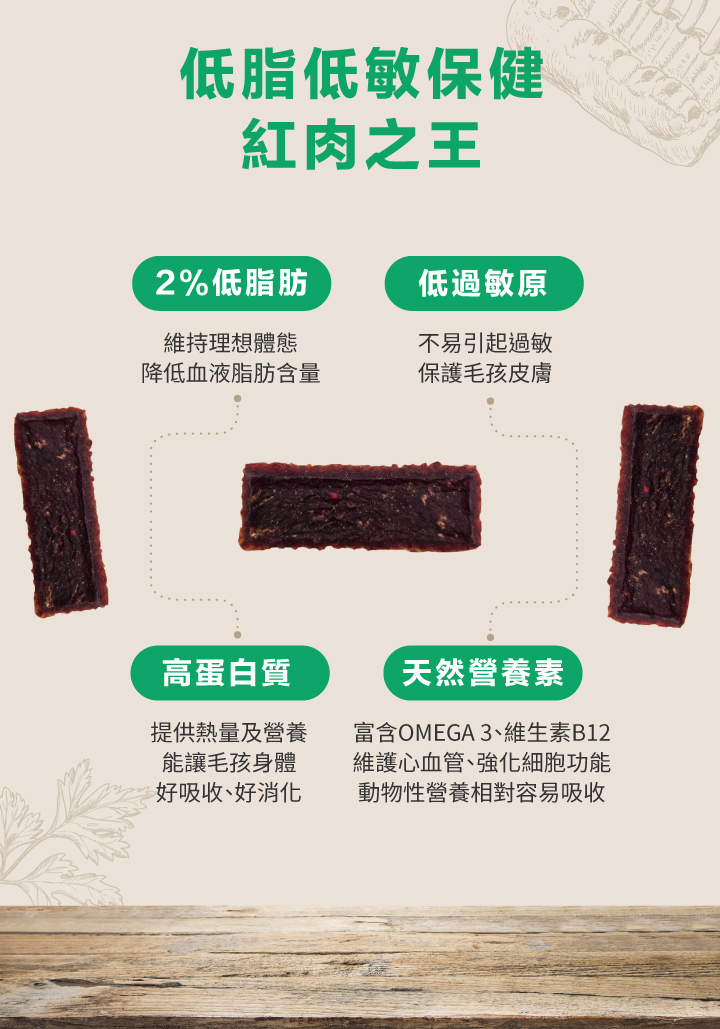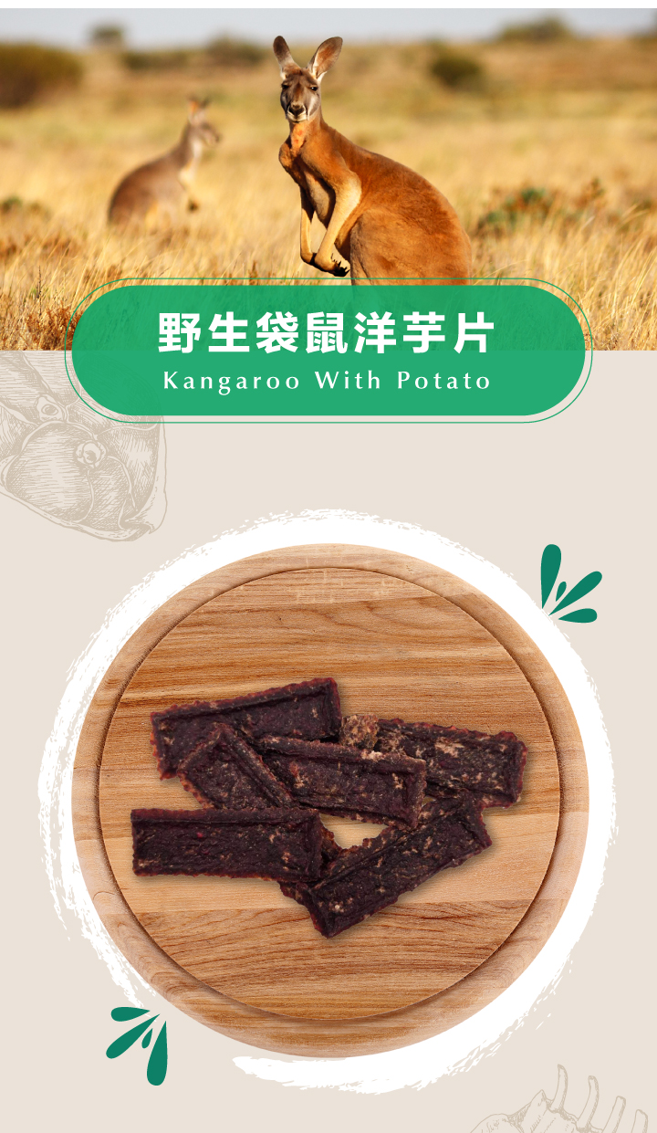 | 成分 | 澳洲袋鼠肉80%、20%馬鈴薯、植物甘油 |