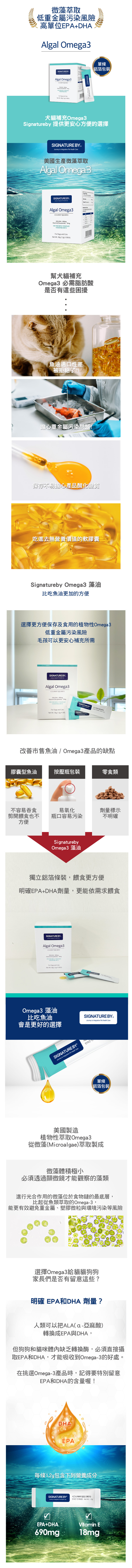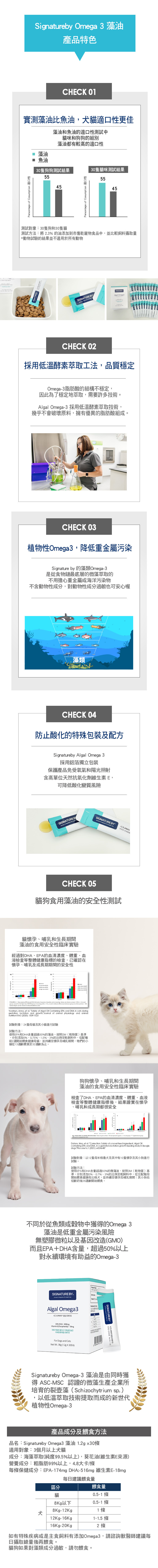| 注意事項 | - 若為特殊疾病或主食飼料已含 Omega3,建議諮詢獸醫師,調整總攝取量後再餵食 - 若寵物對海藻類成分過敏,請勿餵食 |