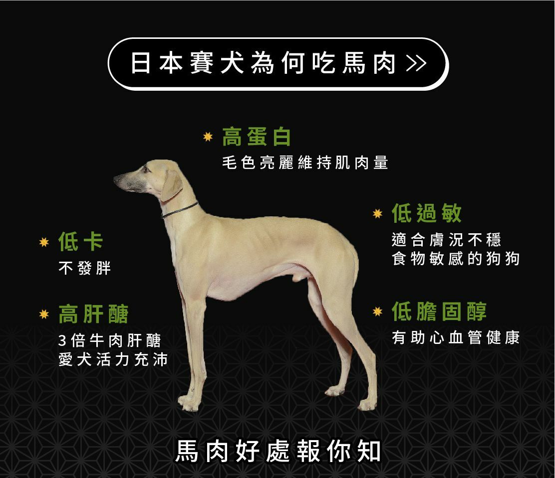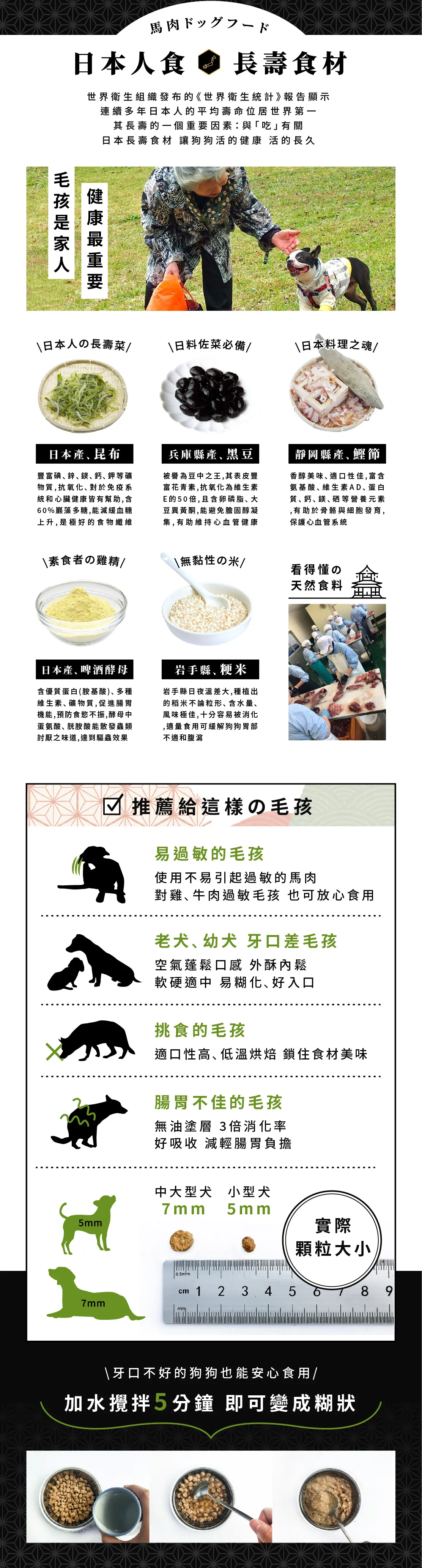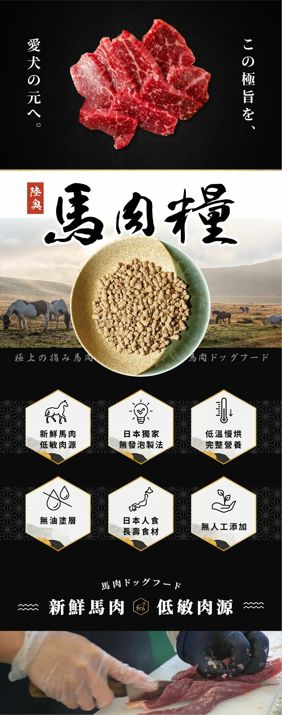 | 成分 | 馬肉、魚肉(金澤港時令魚)、馬肝、全麥大麥、糙米、脫脂大豆、高粱、脫脂米糠、魚粉、棕櫚粉、鳴門金時紅藷紅薯、馬鈴薯、烤芝麻、葵花籽油、乳清蛋白、豆豉、海藻粉、蛋殼鈣、脫脂奶粉、果寡糖、乳酸菌 |