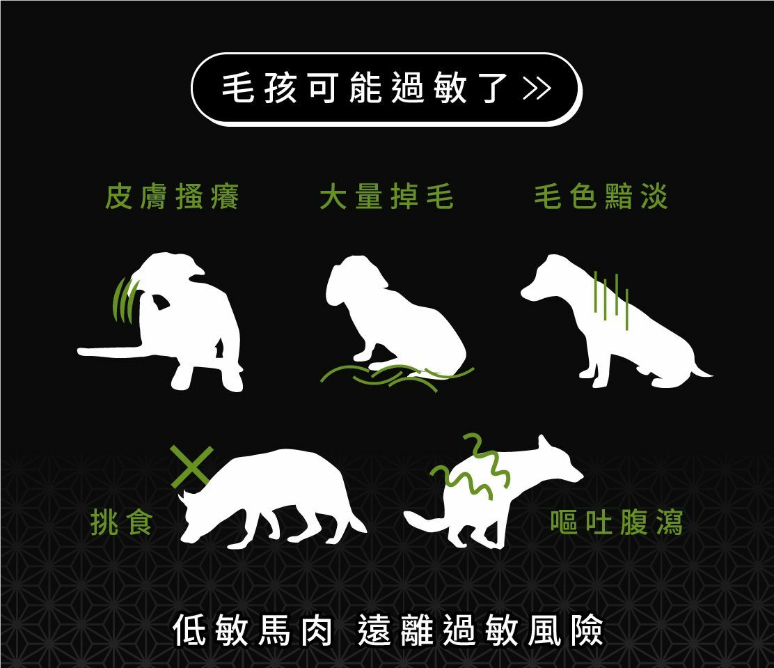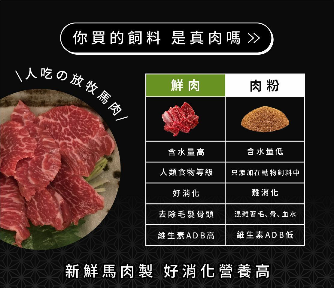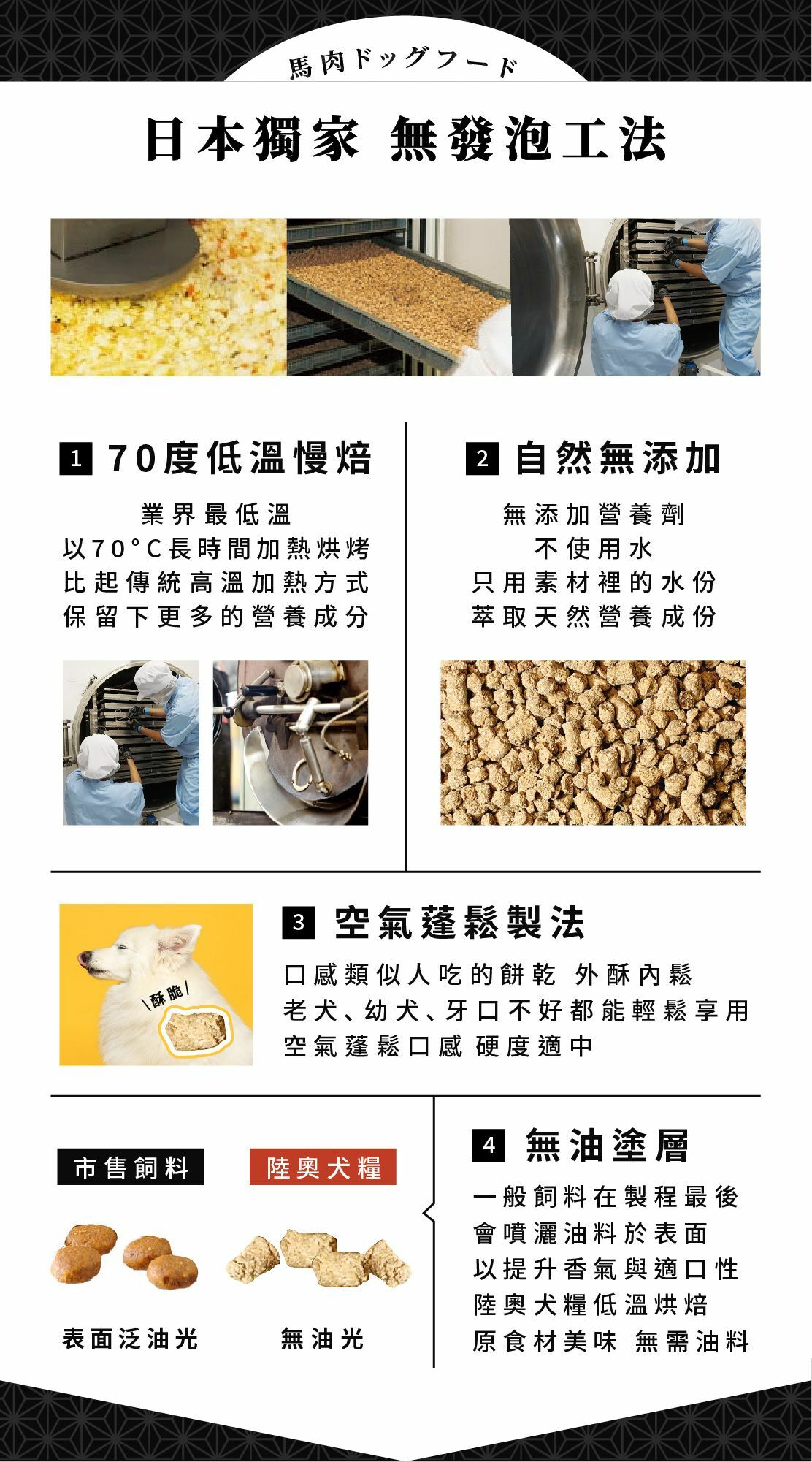 | 成分 | 馬肉、魚肉(金澤港時令魚)、馬肝、全麥大麥、糙米、脫脂大豆、高粱、脫脂米糠、魚粉、棕櫚粉、鳴門金時紅藷紅薯、馬鈴薯、烤芝麻、葵花籽油、乳清蛋白、豆豉、海藻粉、蛋殼鈣、脫脂奶粉、果寡糖、乳酸菌 |