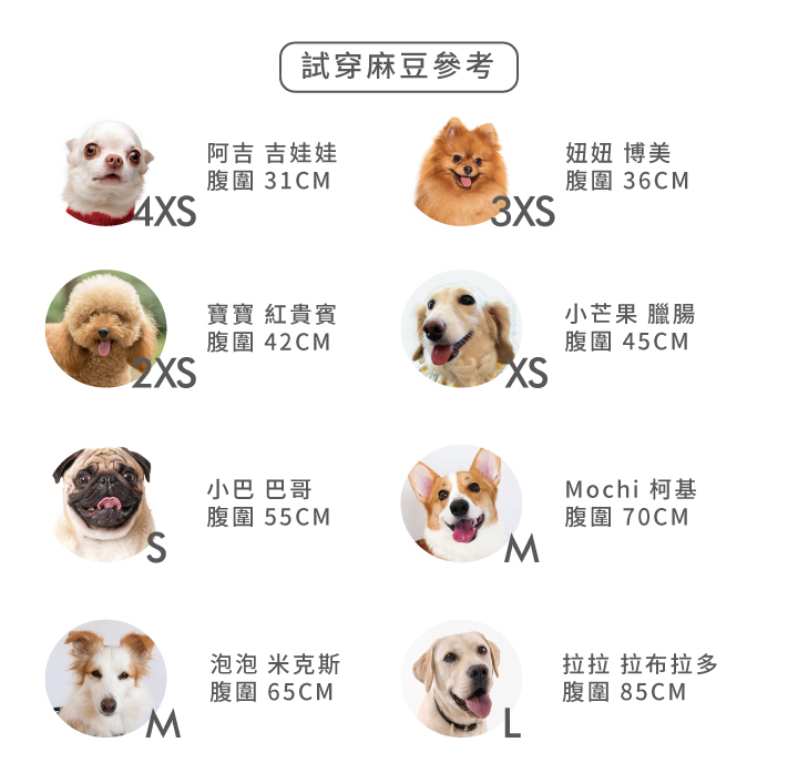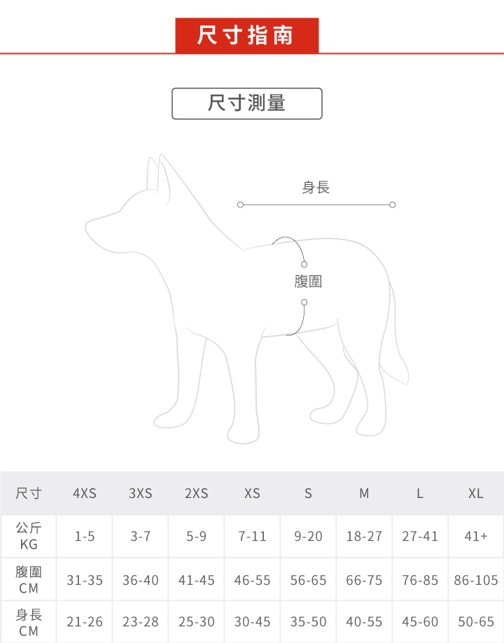 浮水衣建議以腹圍尺寸作為主要選購依據,因為不同狗狗的體型比例不同,有時候穿起來衣長可能會略短,這是正常的喔~