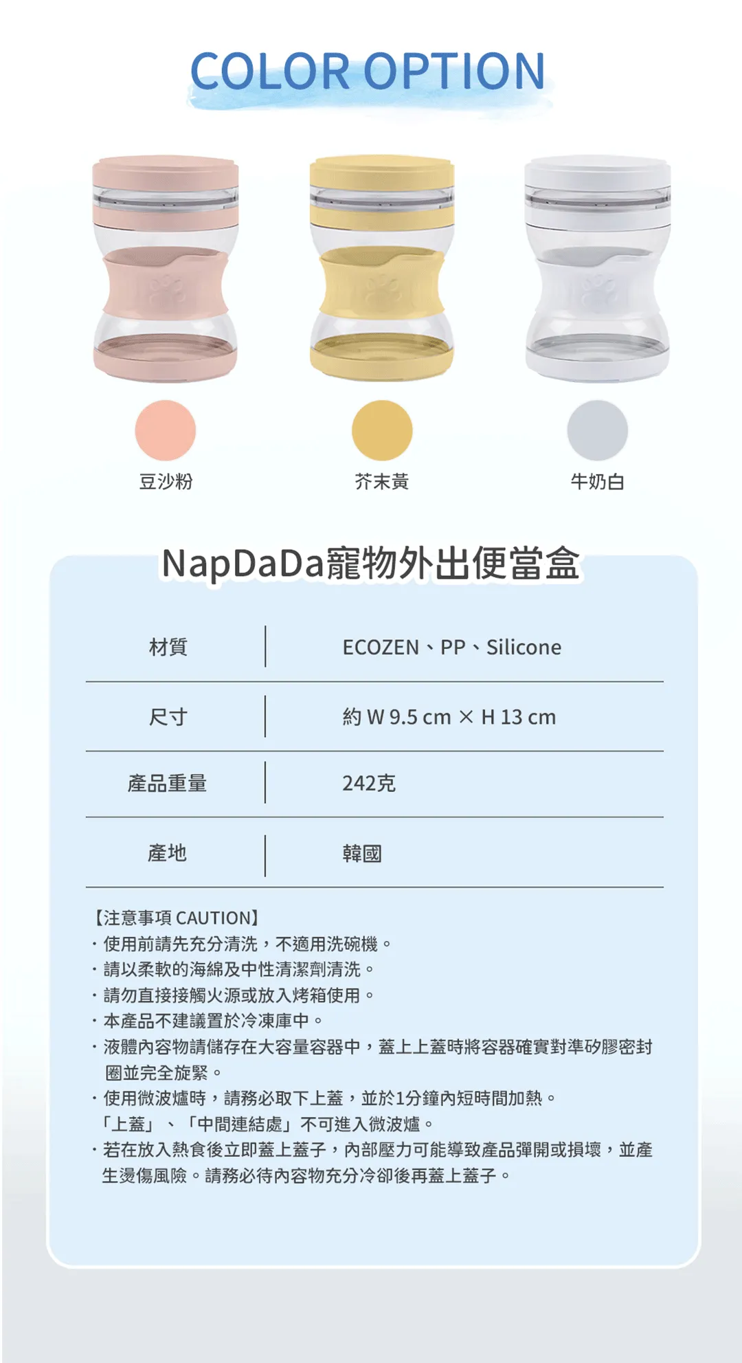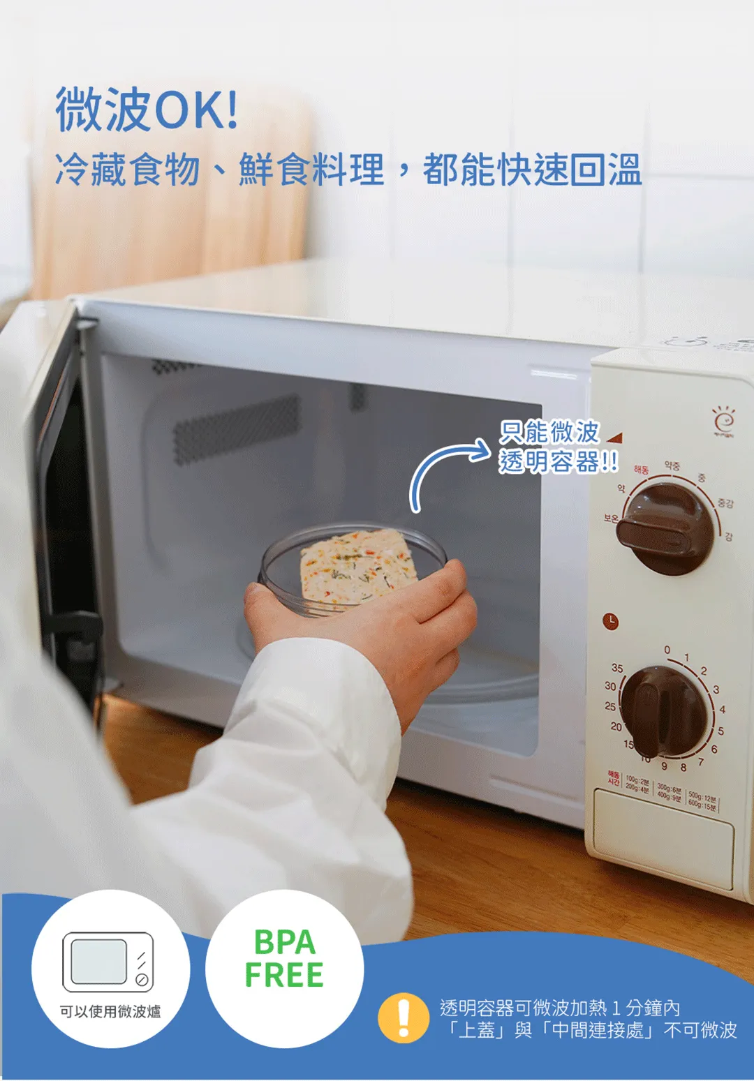 | 注意事項 | ・使用前請先充分清洗,不適用洗碗機。 ・請以柔軟的海綿及中性清潔劑清洗。 ・請勿直接接觸火源或放入烤箱使用。 ・本產品不建議置於冷凍庫中。 ・液體內容物請儲存在大容量容器中,蓋上上蓋時將容器確實對準矽膠密封圈並完全旋緊。 ・使用微波爐時,請務必取下上蓋,並於1分鐘內短時間加熱。「上蓋」、「中間連結處」不可進入微波爐。 ・若在放入熱食後立即蓋上蓋子,內部壓力可能導致產品彈開或損壞,並產生燙傷風險。請務必待內容物充分冷卻後再蓋上蓋子。 |