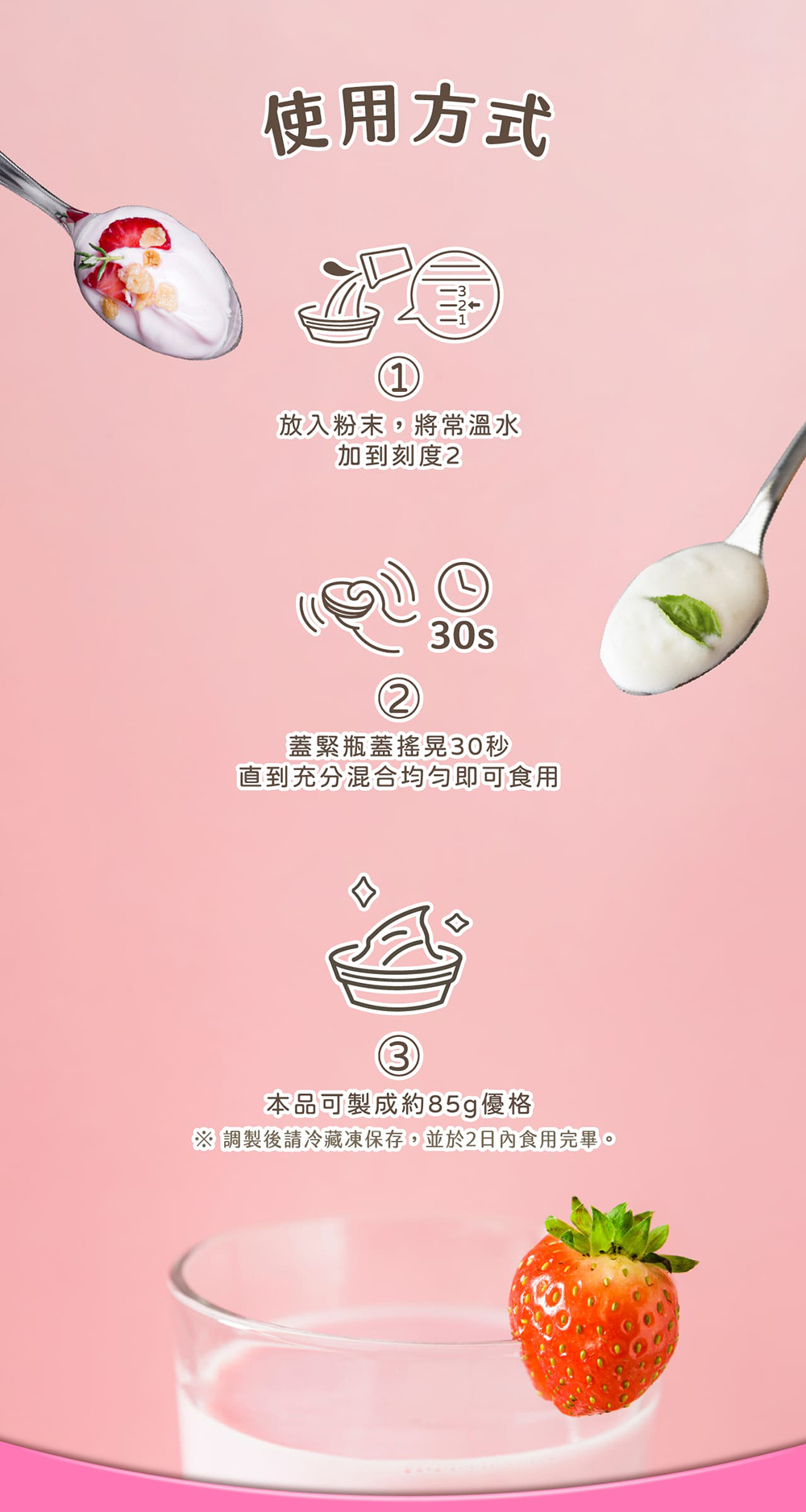 | 使用方法 | ①放入粉末,將水加到刻度2,蓋緊瓶蓋搖晃30秒,直到充分混合均勻即可食用(注意水加過多會變太稀)。 ②本品可製成約85g優格。 |