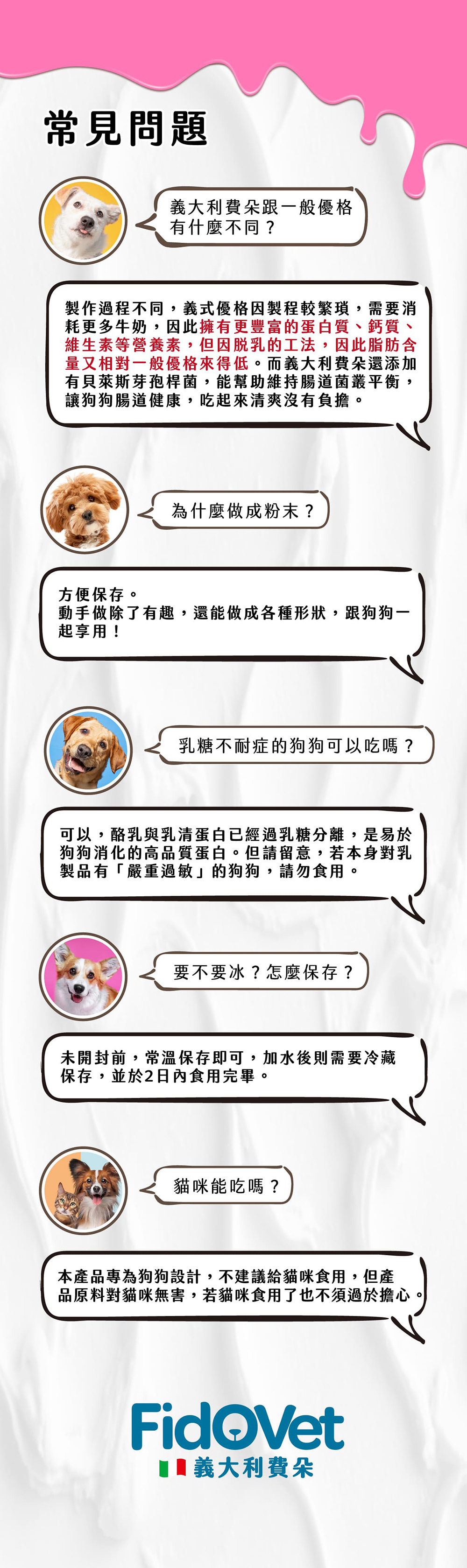 | 注意事項 | ①本產品僅供犬食用。 ②請勿直接食用粉末,以免吸入性嗆傷。 ③本產品添加有酵母,若加水後擺放於室溫太久,會膨脹溢出。 ④本產品含有乳製品和玉米,不適合對其過敏的狗狗食用。 |