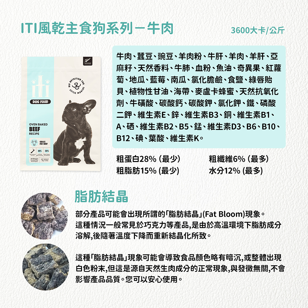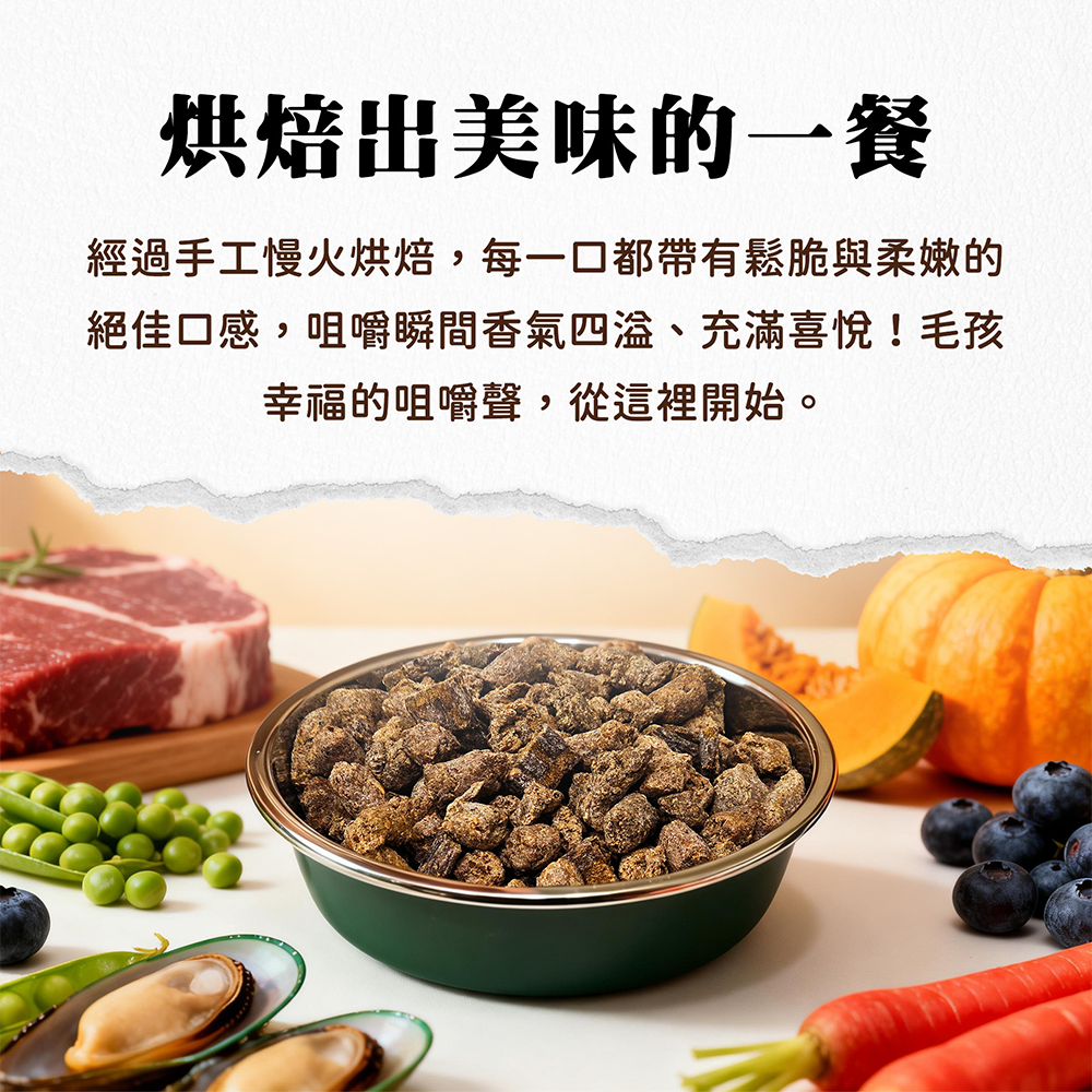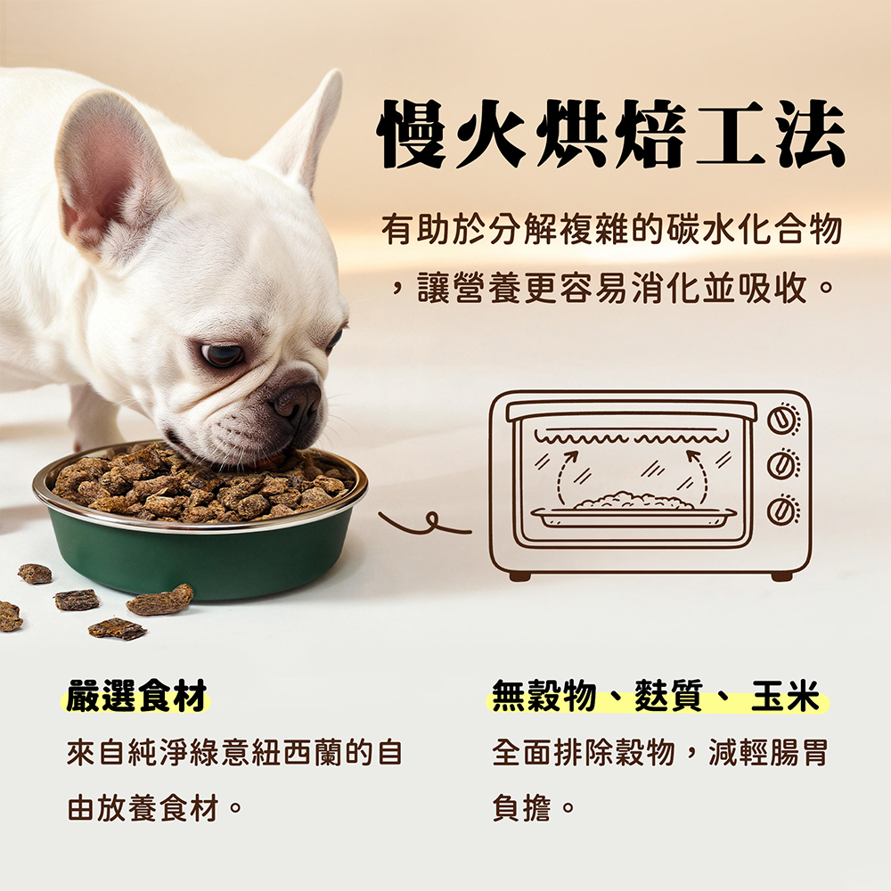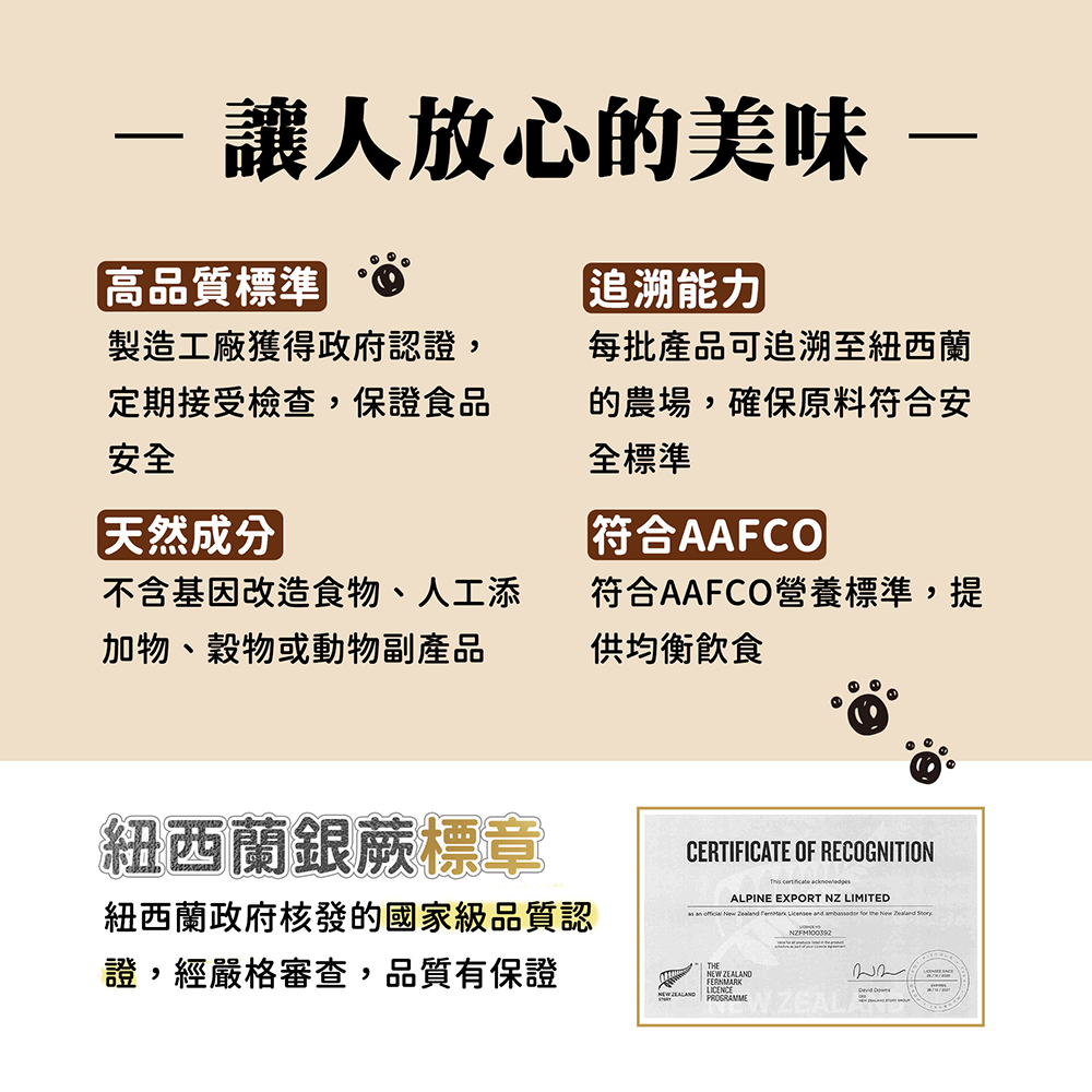 | 成分 | 牛肉、蠶豆、豌豆、羊肉粉、牛肝、羊肉、羊肝、亞麻籽、天然香料、牛肺、血粉、魚油、奇異果、紅蘿蔔、地瓜、藍莓、南瓜、氯化膽鹼、食鹽、絲唇胎貝、植物性甘油、海帶、麥盧卡蜂蜜、天然抗氧化劑、牛璜酸、碳酸鈣、碳酸鉀、氯化鉀、鐵、硝酸二鉀、維生素E、鋅、維生素B3、銅、維生素B1、A、硒、維生素B2、B5、錳、維生素D3、B6、B10、B12、碘、葉酸、維生素K |