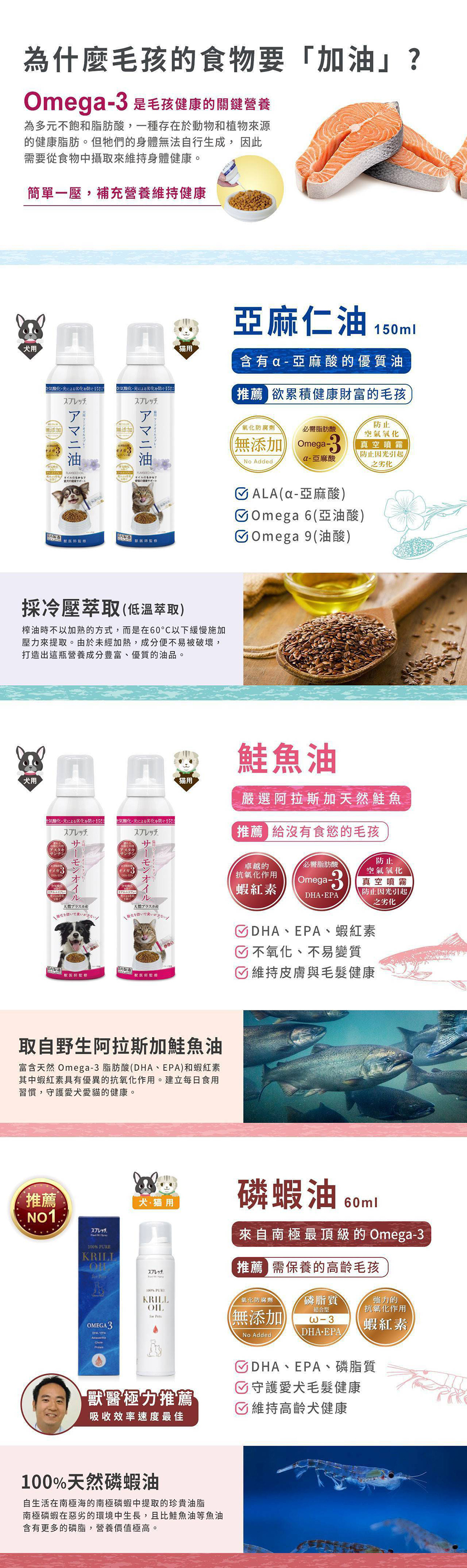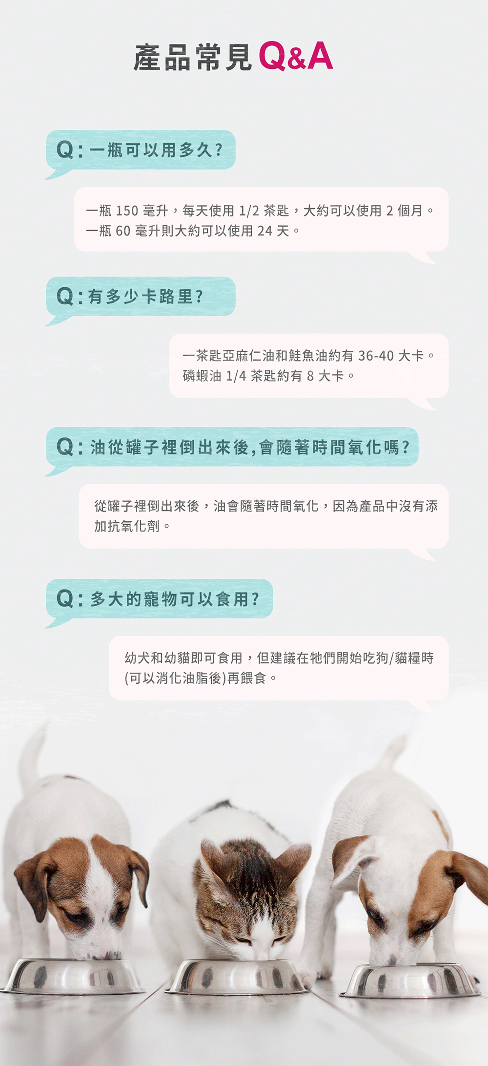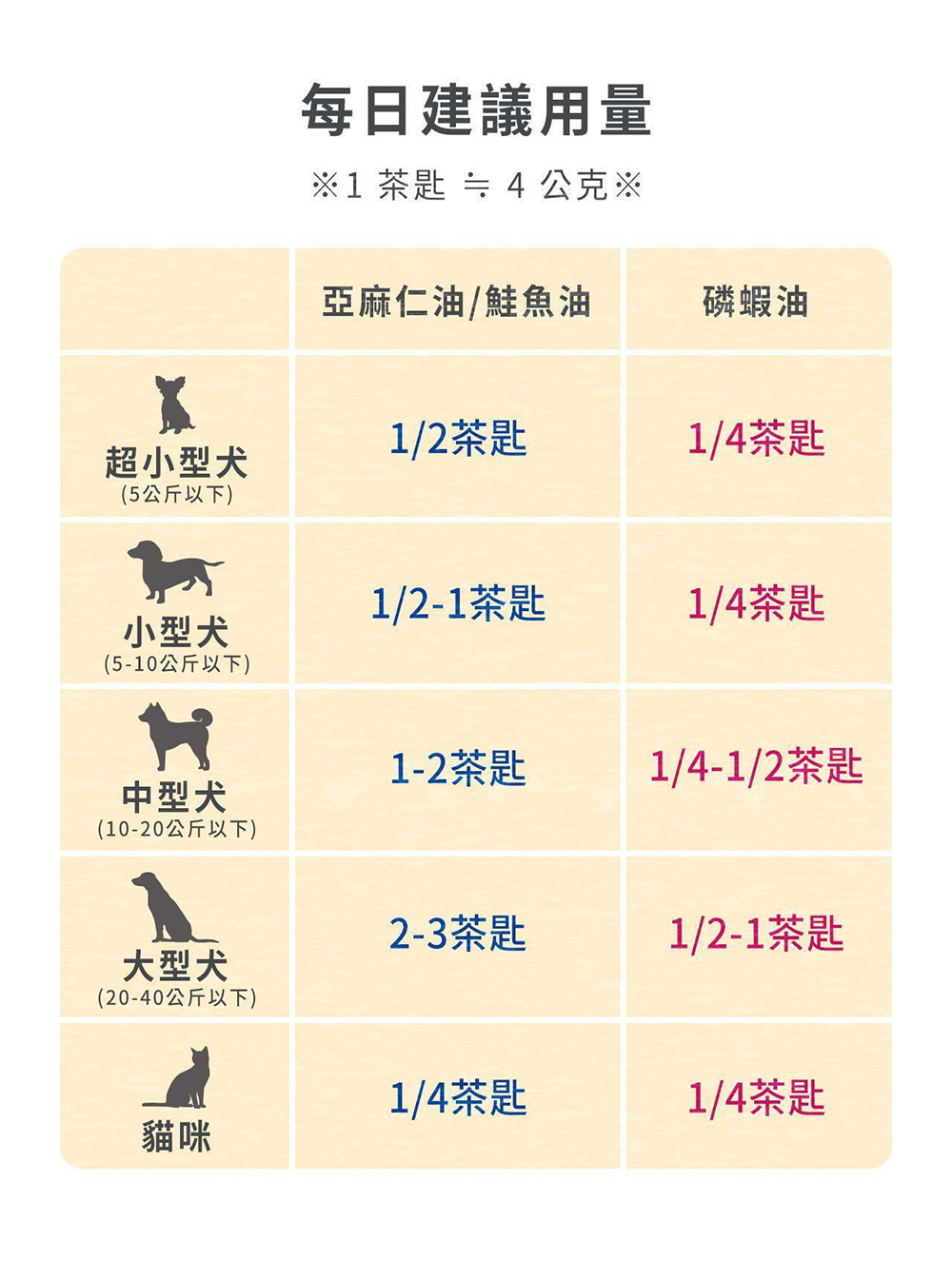 | 注意事項 |             -請存放於乾燥陰涼常溫處,避免潮濕、高溫40度以上、陽光直射處 -狗狗與貓咪餵食方式有所不同,請根據廠商建議餵食量,並視寵物便便情形和健康狀況進行調整 -餵食後如有身體不適情形,請立即停止使用,並諮詢獸醫師 -請存於孩童、寵物無法觸及的地方,避免發生危險  |