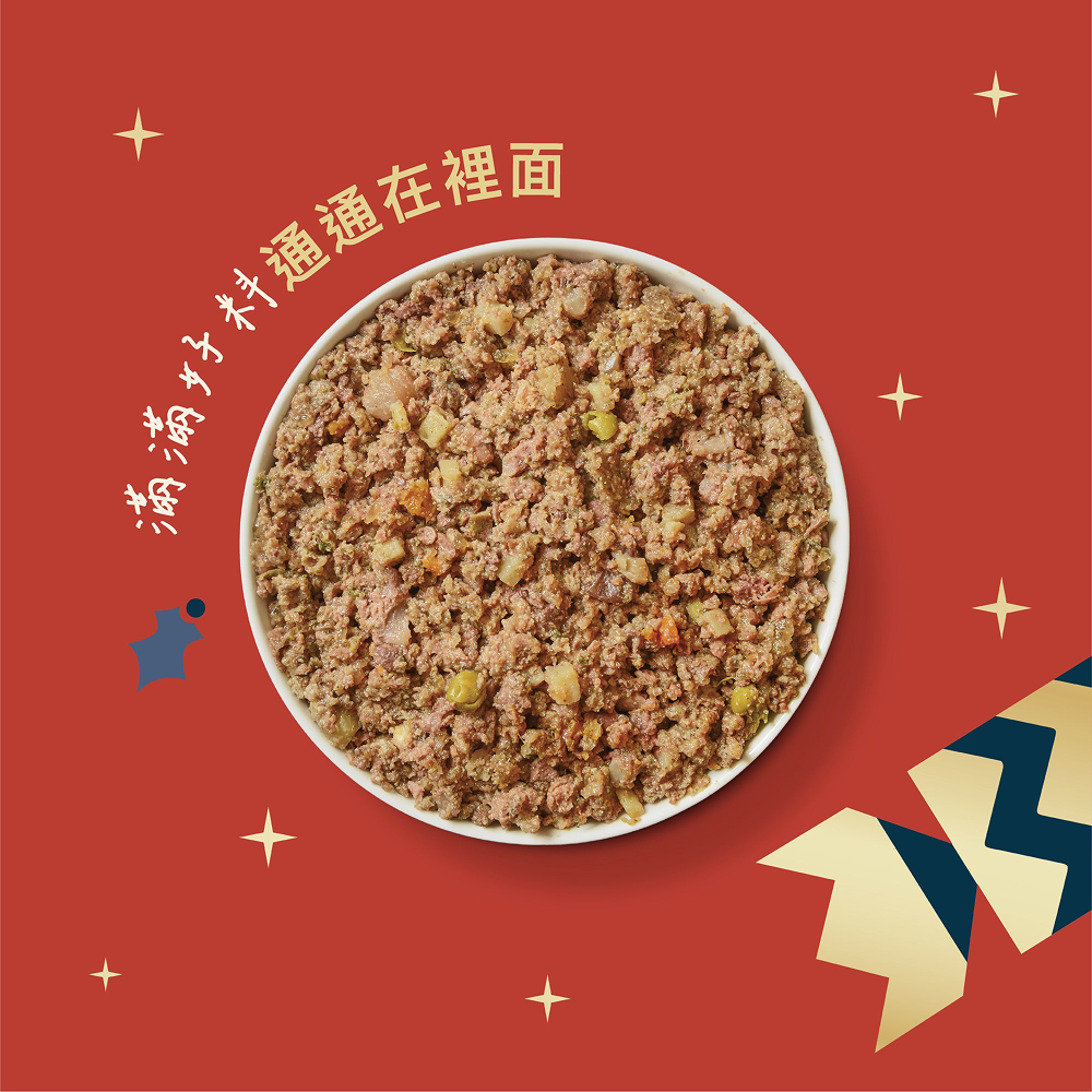| 成分 | 新鮮火雞肉 (50%)、新鮮豬肉 (10%)、蔓越莓 (3%)、馬鈴薯 (2%)、歐洲防風草 (2%)、胡蘿蔔 (2%)、高麗菜 (1%)、豌豆 (1%)、礦物質 |
