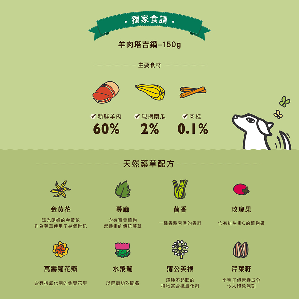 | 原材料 | 新鮮羊肉(60%)、蒸粗麥粉(3%)、南瓜(2%)、綠花椰菜、杏子(2%)、羽衣甘藍、礦物質、糙米、薑黃(0.1%)、肉桂(0.1%) |