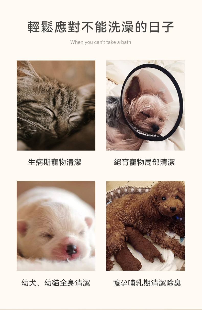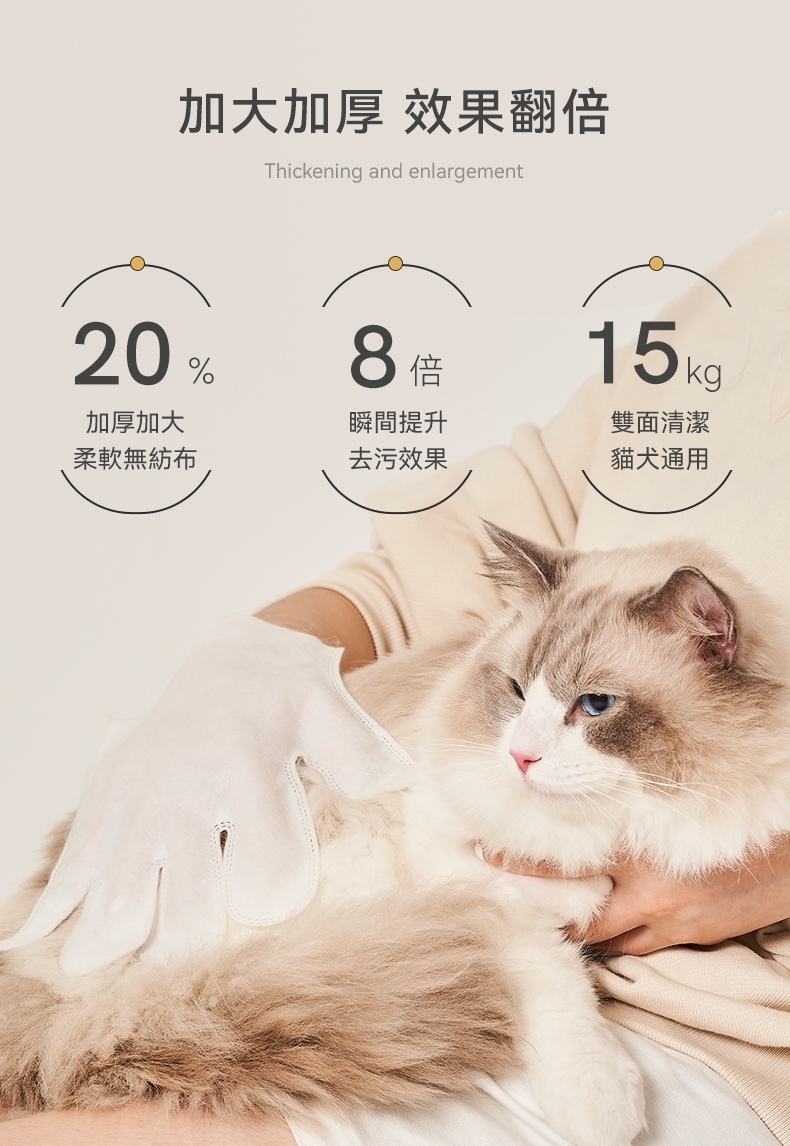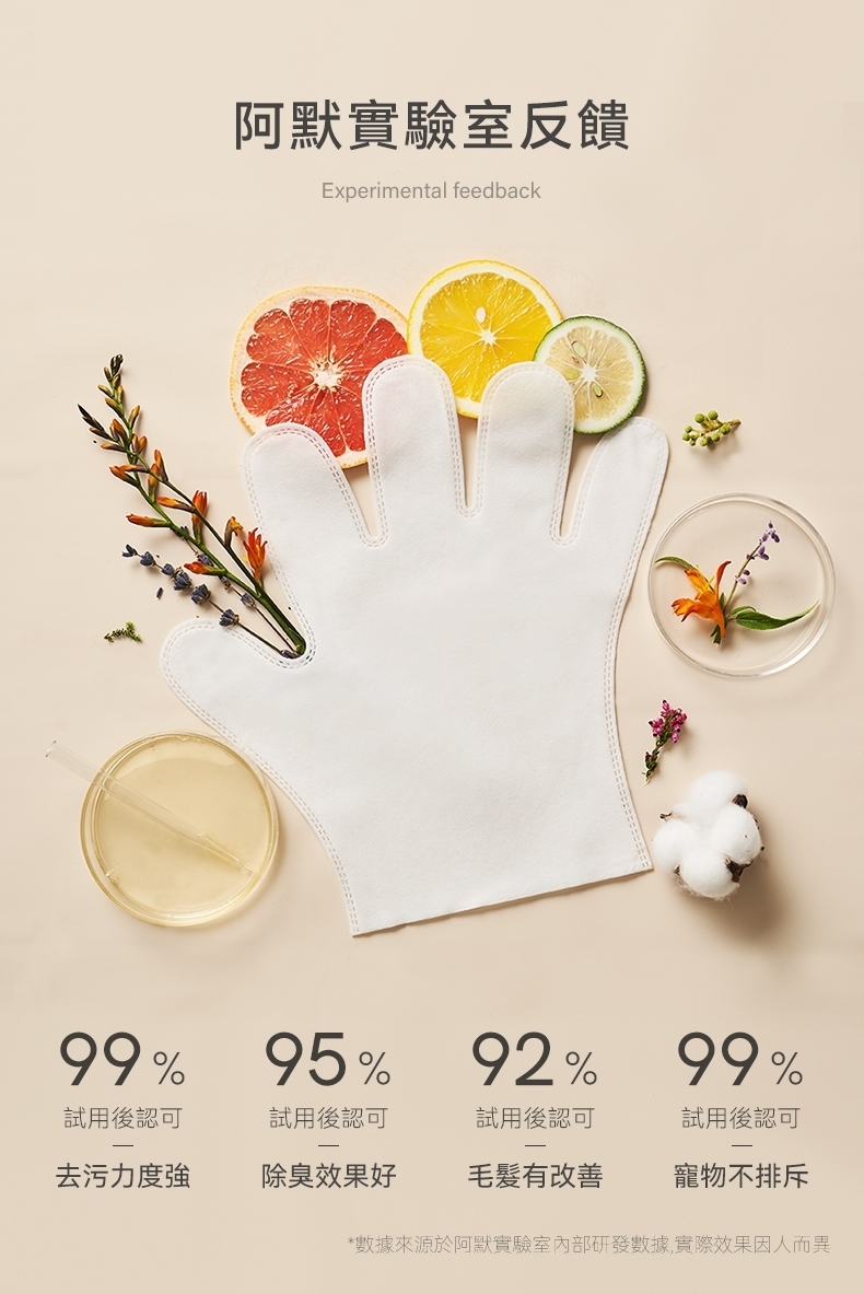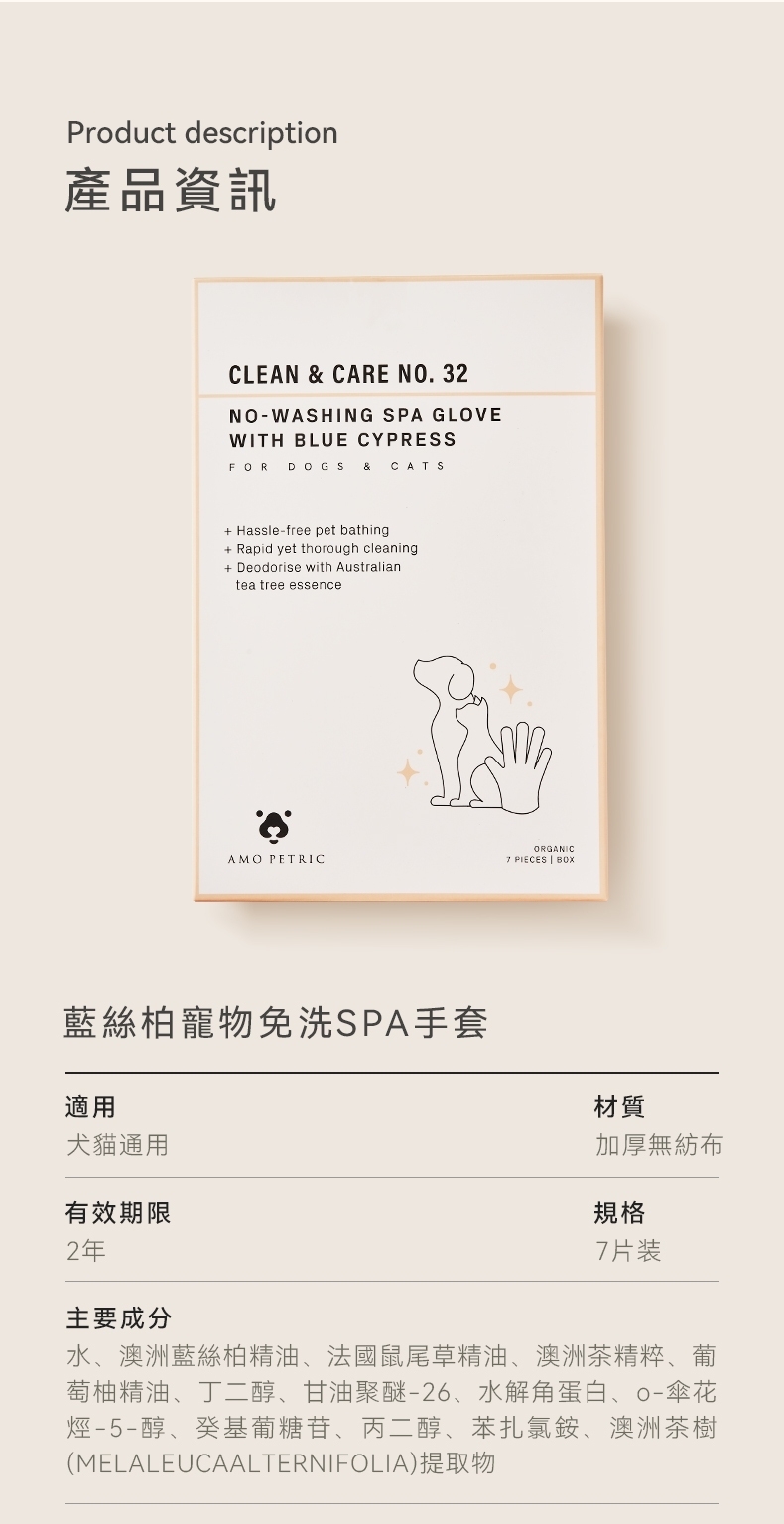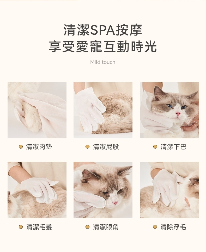 | 使用方法 | step 1 取出手套邊按摩邊輕柔擦拭毛孩 step 2 擦拭完自然乾即可,特別需要,也可使用吹風機吹乾並梳理毛髮 step 3 手套左右對稱,雙手均可使用 |