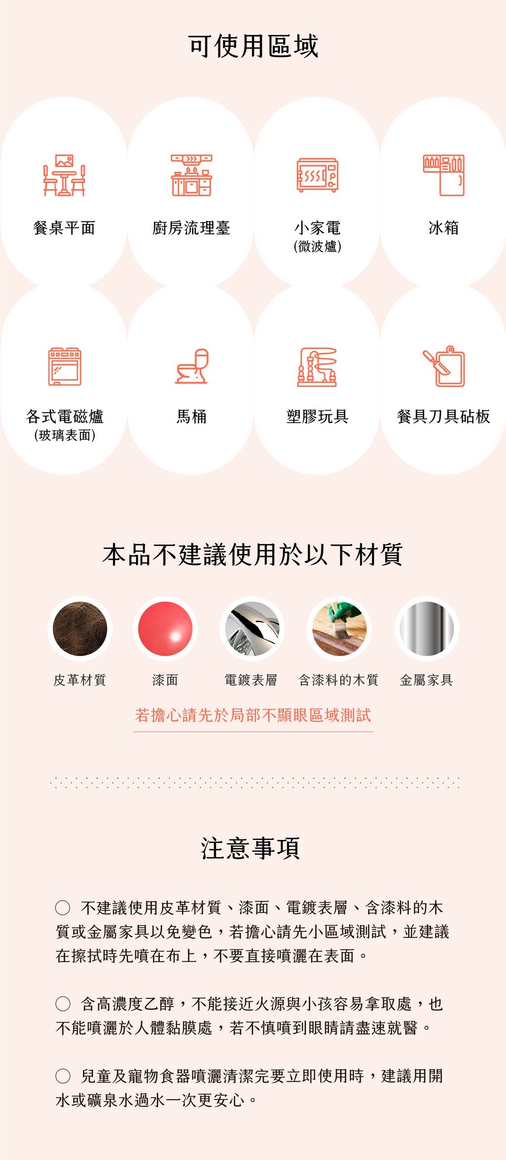 | 使用方式 | 直接噴灑,不須水洗,建議用乾淨的布或紙巾擦拭,效果更佳 |