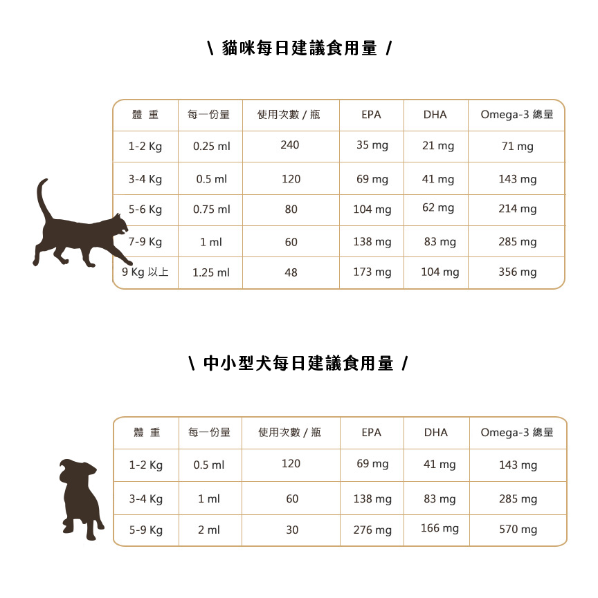 | 食用方式 | 請依照建議食用量給予您的寵物,可加入飼料中或單獨食用,但請勿直接用滴管將魚油滴入貓狗口中 |