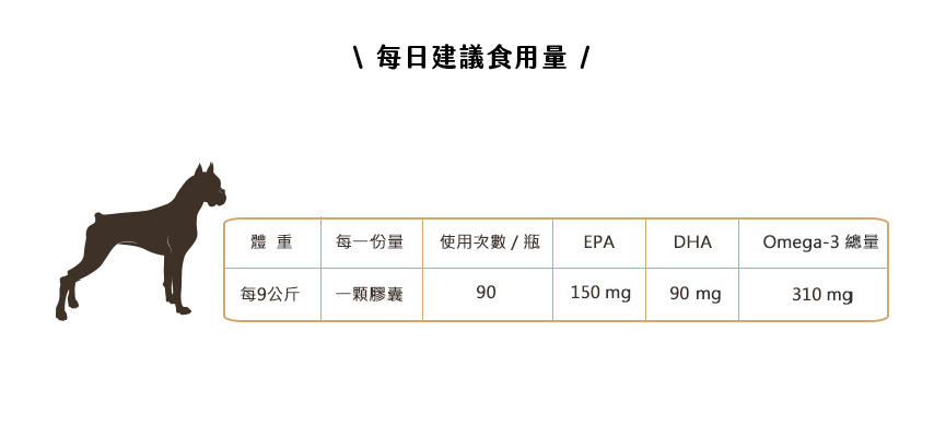 | 食用方式 | 小型犬 - 膠囊刺破後,將魚油直接擠出至食物上,或單獨食用 大型犬 - 直接將膠囊加入食物中食用,或單獨食用 |