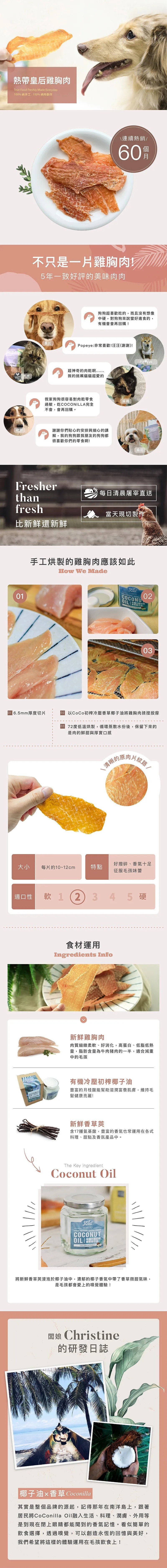 | 成分 | 新鮮現宰雞胸肉、有機香草椰子油 |